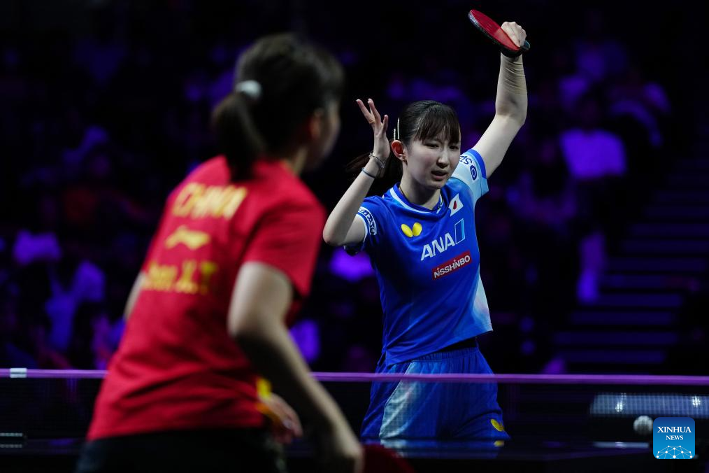 Hayata Hina (R) hits a return during the women's singles quarterfinal between Chen Xingtong of China and Hayata Hina of Japan at the WTT Champions Yokohama 2025 in Yokohama, Japan, Aug. 10, 2025. (Xinhua/Jia Haocheng)