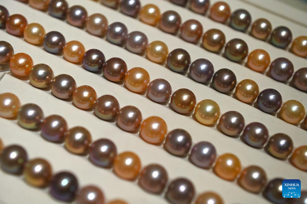 This photo taken on Aug. 9, 2025 shows pearl jewelry products at a trading center for jewelry products in Shanxiahu Town, Zhuji City of east China's Zhejiang Province. Shanxiahu Town of Zhejiang Province is renowned for its pearl industry that ranges from pearl farming, processing, trading to cultural tourism.