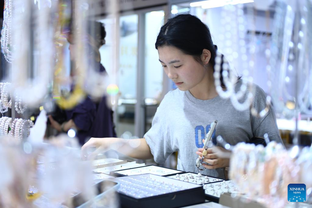 A customer selects pearl jewelry at a trading center for jewelry products in Shanxiahu Town, Zhuji City of east China's Zhejiang Province, Aug. 9, 2025. Shanxiahu Town of Zhejiang Province is renowned for its pearl industry that ranges from pearl farming, processing, trading to cultural tourism.