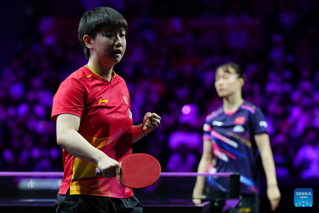 Sun Yingsha (L) of China celebrates scoring during the women's singles semifinal match between Sun Yingsha of China and Shi Xunyao of China at the WTT Champions Yokohama 2025 in Yokohama, Japan, Aug. 11, 2025. (Xinhua/Jia Haocheng)