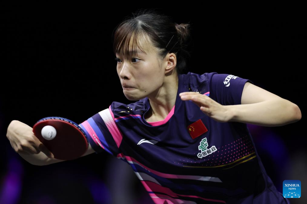 Shi Xunyao of China hits a return during the women's singles semifinal match between Sun Yingsha of China and Shi Xunyao of China at the WTT Champions Yokohama 2025 in Yokohama, Japan, Aug. 11, 2025. (Xinhua/Jia Haocheng)