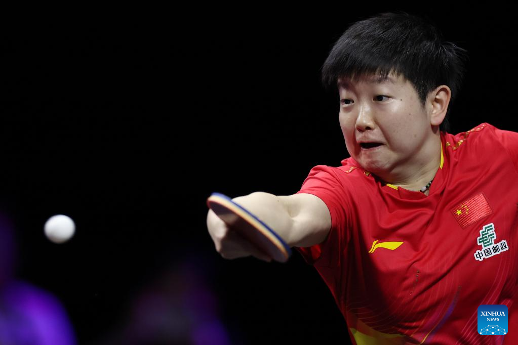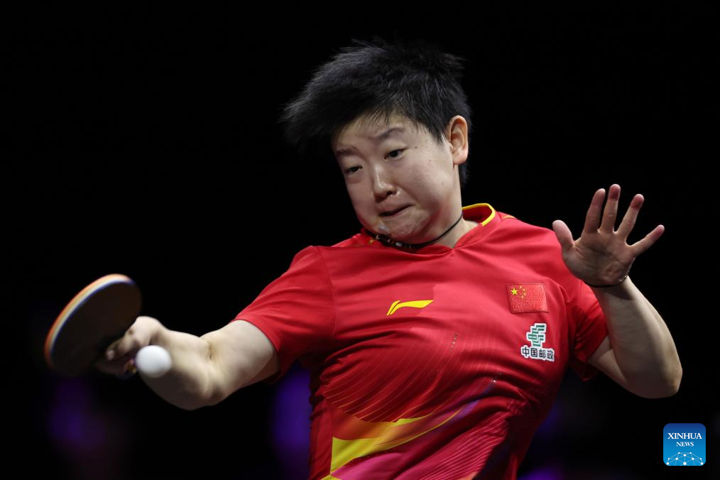 Sun Yingsha of China hits a return during the women's singles semifinal match between Sun Yingsha of China and Shi Xunyao of China at the WTT Champions Yokohama 2025 in Yokohama, Japan, Aug. 11, 2025. (Xinhua/Jia Haocheng)