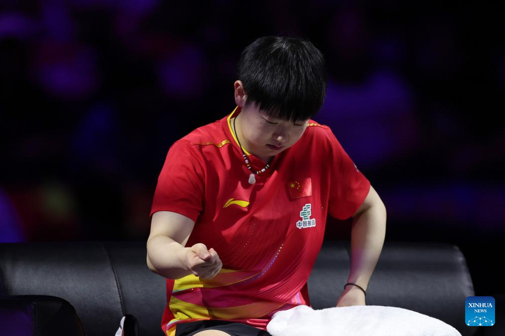 Shi Xunyao of China reacts during the women's singles semifinal match between Sun Yingsha of China and Shi Xunyao of China at the WTT Champions Yokohama 2025 in Yokohama, Japan, Aug. 11, 2025. (Xinhua/Jia Haocheng)