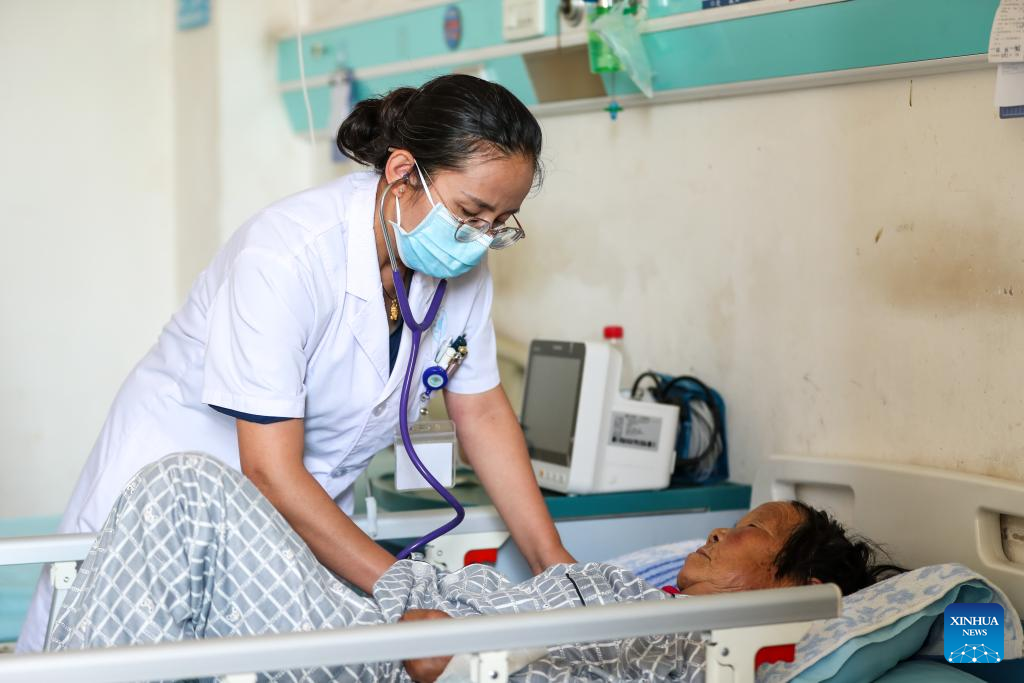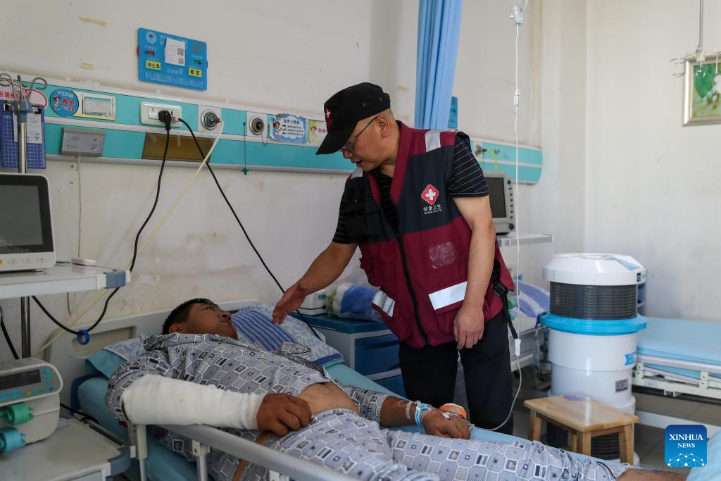 Han Hao (R), an expert of the medical treatment team and deputy director of the emergency department of the second people's hospital of Gansu Province, diagnoses an injured at the first people's hospital of Yuzhong County, in Yuzhong, Lanzhou City, northwest China's Gansu Province, Aug. 11, 2025. Since the mountain torrents occurred in Yuzhong County, the provincial health department has dispatched 26 medical experts to the first people's hospital of the county to guide the treatment of the injured. At present, all the 15 injured people, who have been transferred to the hospitals at the provincial and county levels for treatment, have been out of danger. (Xinhua/Lang Bingbing)