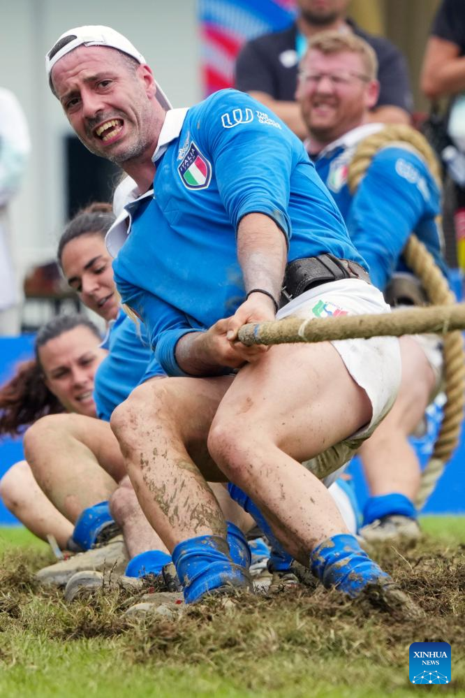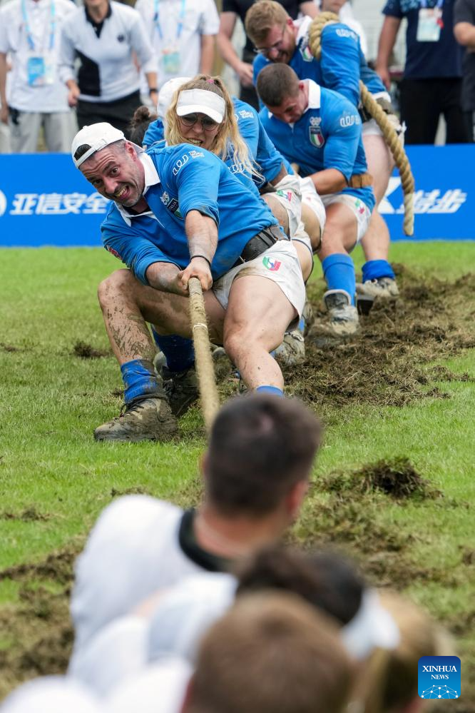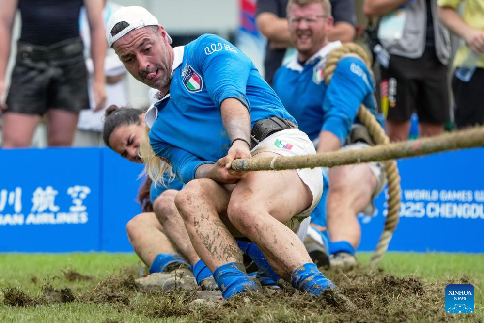 Team Italy compete during the Mixed Outdoor 580kg Bronze Medal Match between Germany and Italy of Tug of War event at The World Games 2025 in Chengdu, southwest China's Sichuan Province, Aug. 11, 2025. (Xinhua/Li Bo)