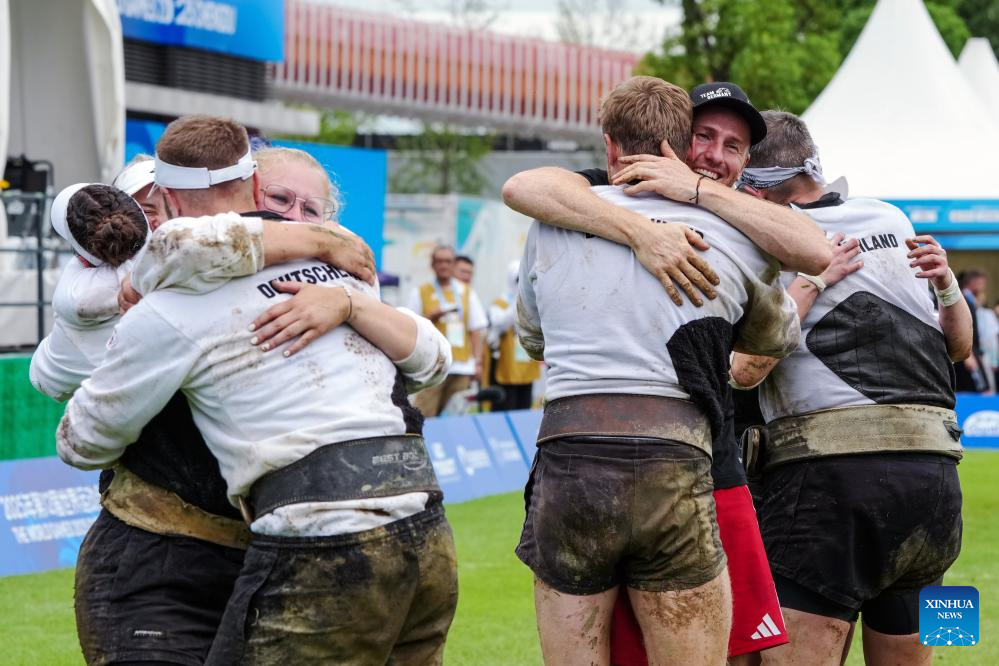 Players of team Germany celebrate after winning the Mixed Outdoor 580kg Bronze Medal Match between Germany and Italy of Tug of War event at The World Games 2025 in Chengdu, southwest China's Sichuan Province, Aug. 11, 2025. (Xinhua/Li Bo)