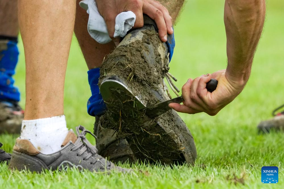 A member of team Italy clears the mud of the shoe during the Mixed Outdoor 580kg Bronze Medal Match between Germany and Italy of Tug of War event at The World Games 2025 in Chengdu, southwest China's Sichuan Province, Aug. 11, 2025. (Xinhua/Li Bo)