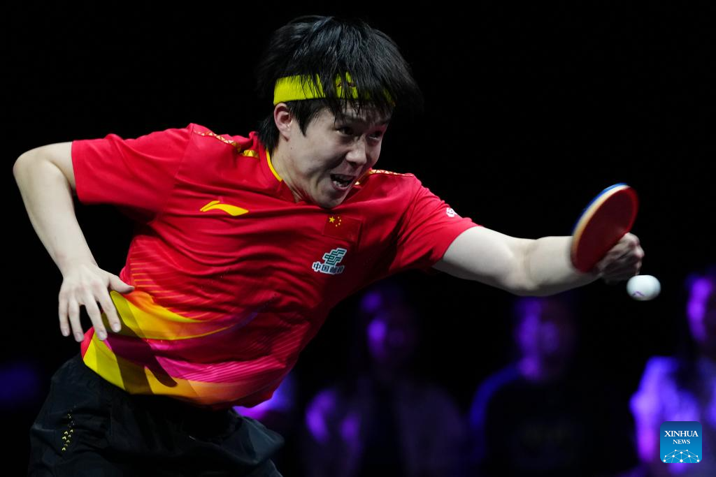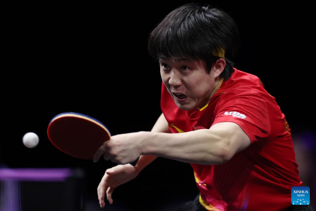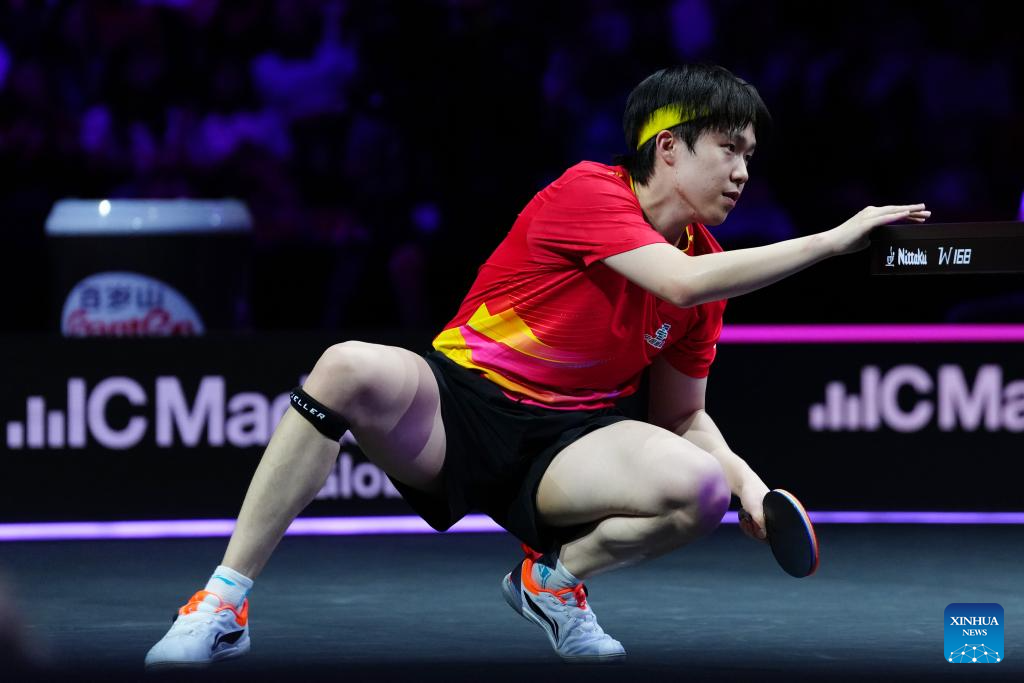 Wang Chuqin competes during the men's singles final match between Wang Chuqin of China and Harimoto Tomokazu of Japan at the WTT Champions Yokohama 2025 in Yokohama, Japan, Aug. 11, 2025. (Xinhua/Jia Haocheng)