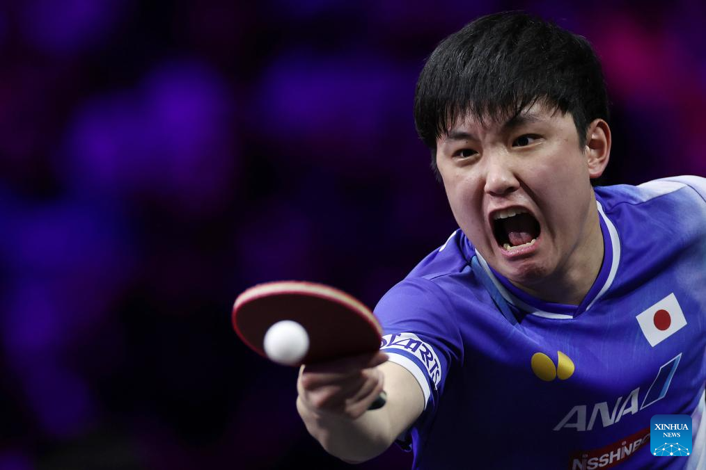 Harimoto Tomokazu competes during the men's singles final match between Wang Chuqin of China and Harimoto Tomokazu of Japan at the WTT Champions Yokohama 2025 in Yokohama, Japan, Aug. 11, 2025. (Xinhua/Jia Haocheng)