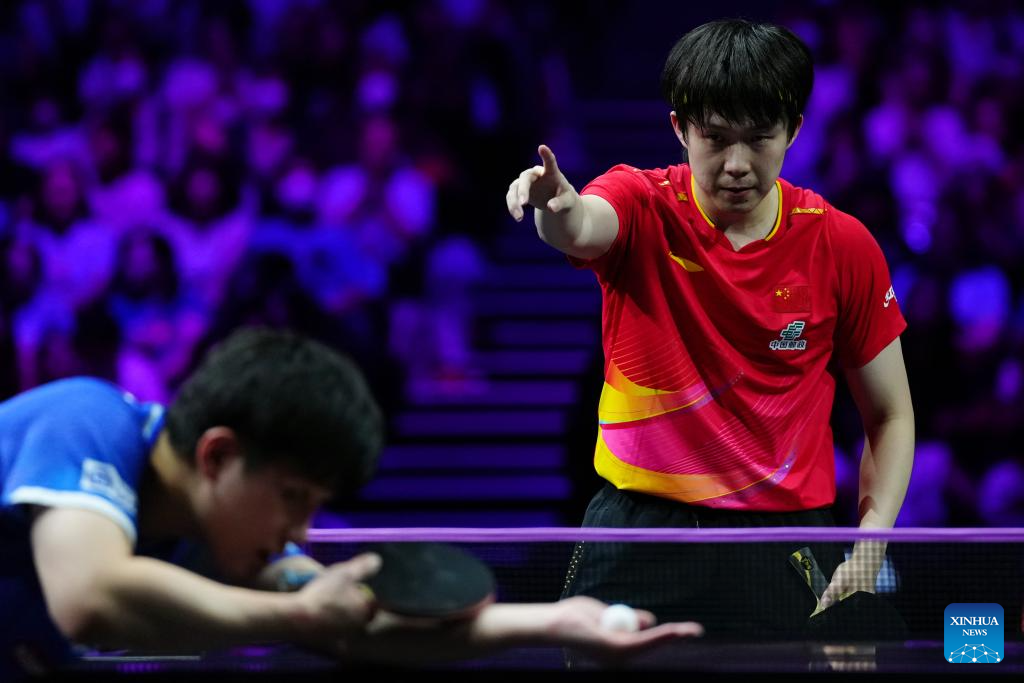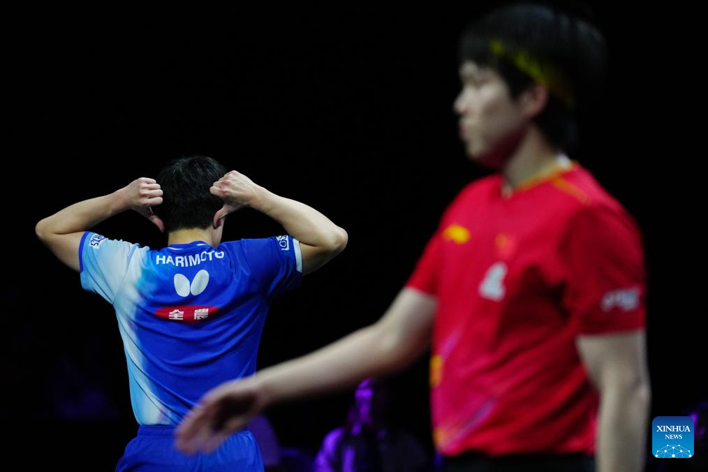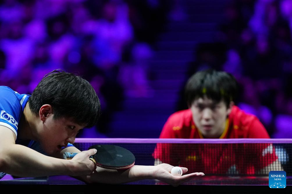 Wang Chuqin (R) competes during the men's singles final match between Wang Chuqin of China and Harimoto Tomokazu of Japan at the WTT Champions Yokohama 2025 in Yokohama, Japan, Aug. 11, 2025. (Xinhua/Jia Haocheng)