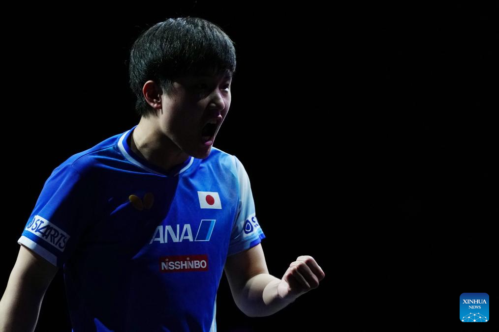 Harimoto Tomokazu celebrates scoring during the men's singles final match between Wang Chuqin of China and Harimoto Tomokazu of Japan at the WTT Champions Yokohama 2025 in Yokohama, Japan, Aug. 11, 2025. (Xinhua/Jia Haocheng)