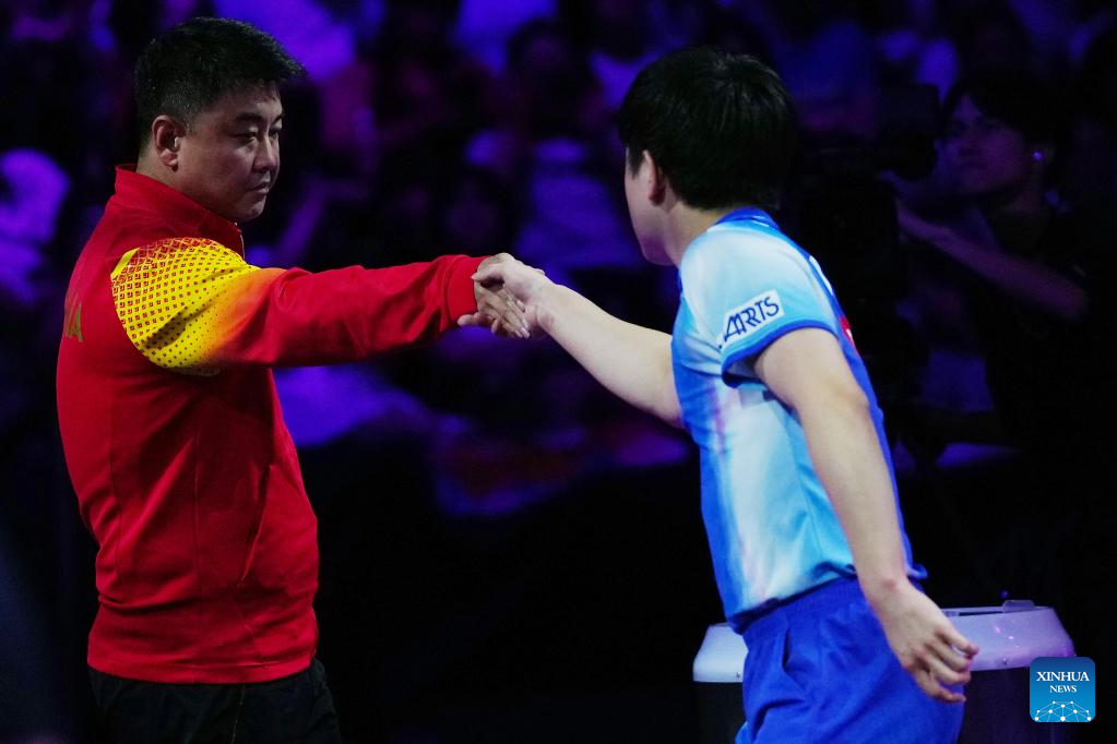 China's coach Wang Hao (L) greets Harimoto Tomokazu after the men's singles final match between Wang Chuqin of China and Harimoto Tomokazu of Japan at the WTT Champions Yokohama 2025 in Yokohama, Japan, Aug. 11, 2025. (Xinhua/Jia Haocheng)