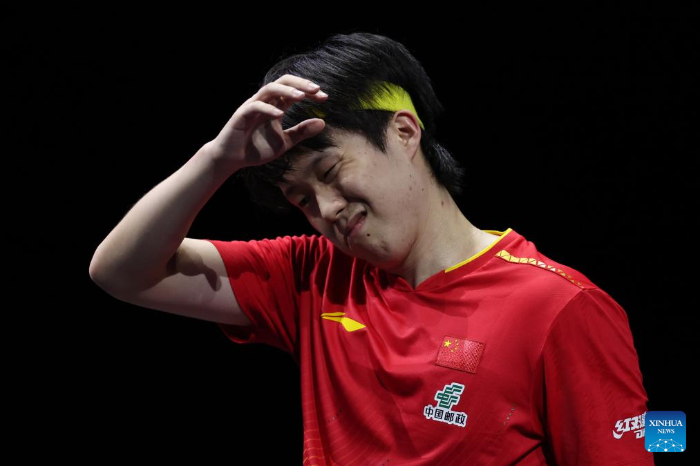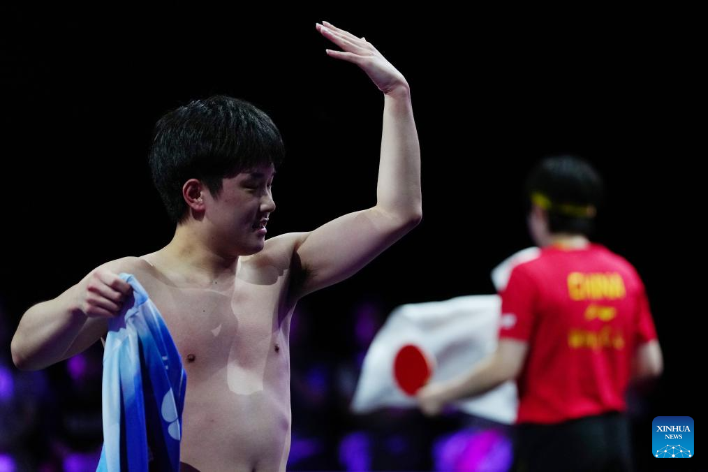 Wang Chuqin reacts during the men's singles final match between Wang Chuqin of China and Harimoto Tomokazu of Japan at the WTT Champions Yokohama 2025 in Yokohama, Japan, Aug. 11, 2025. (Xinhua/Jia Haocheng)