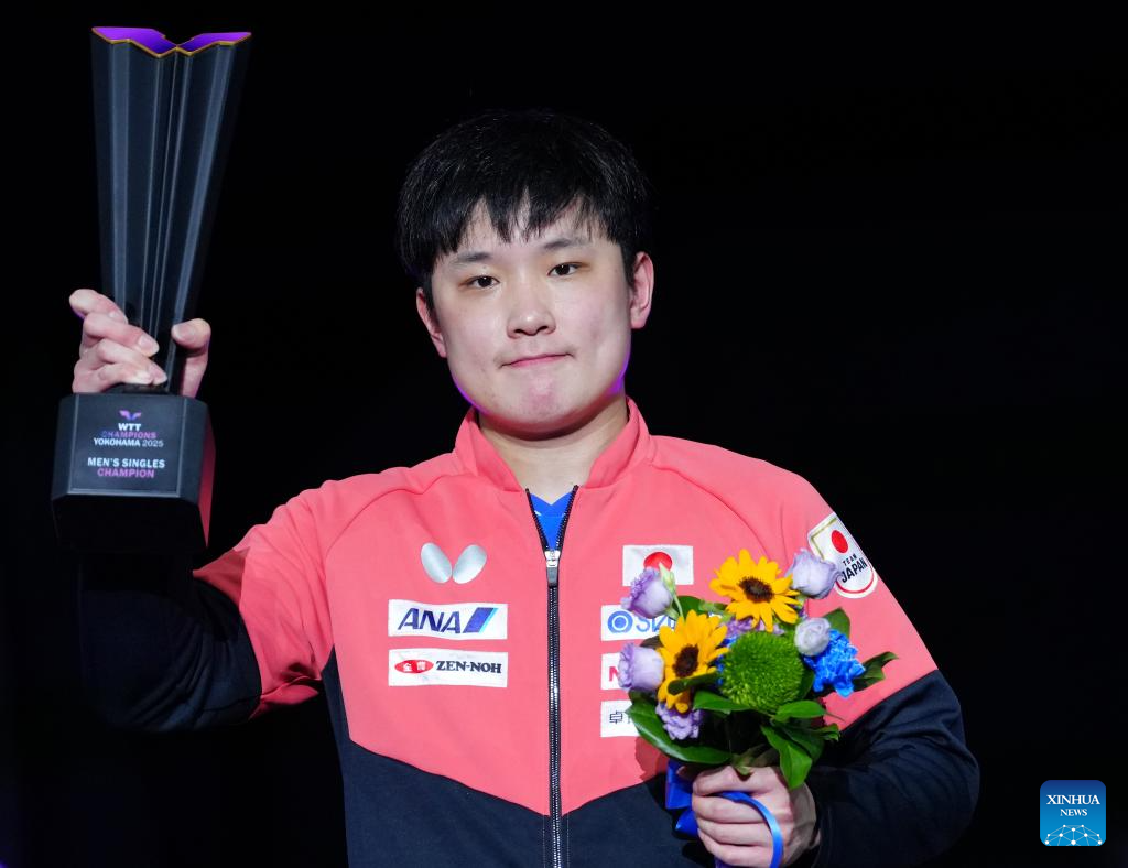 Winner Harimoto Tomokazu poses during the awarding ceremony after the men's singles final match between Wang Chuqin of China and Harimoto Tomokazu of Japan at the WTT Champions Yokohama 2025 in Yokohama, Japan, Aug. 11, 2025. (Xinhua/Jia Haocheng)