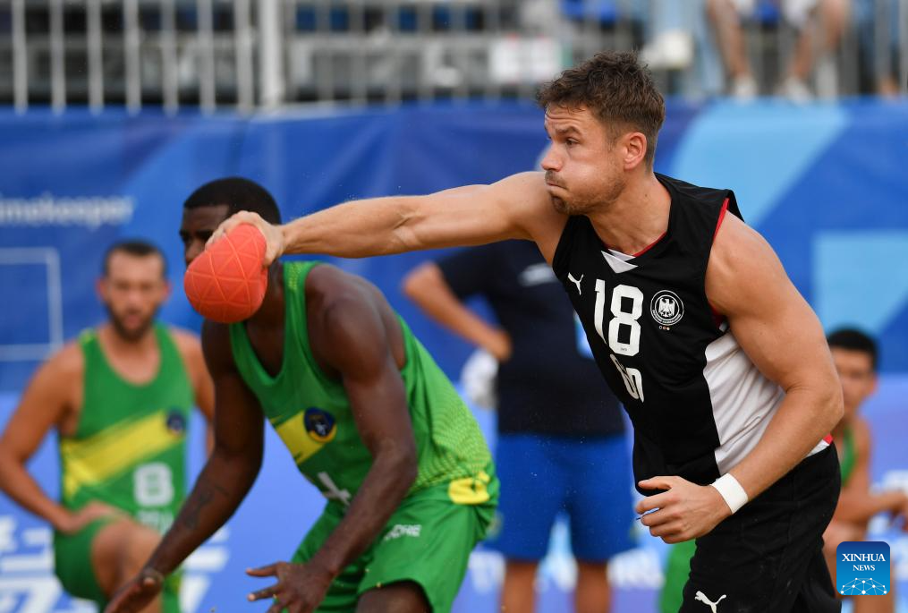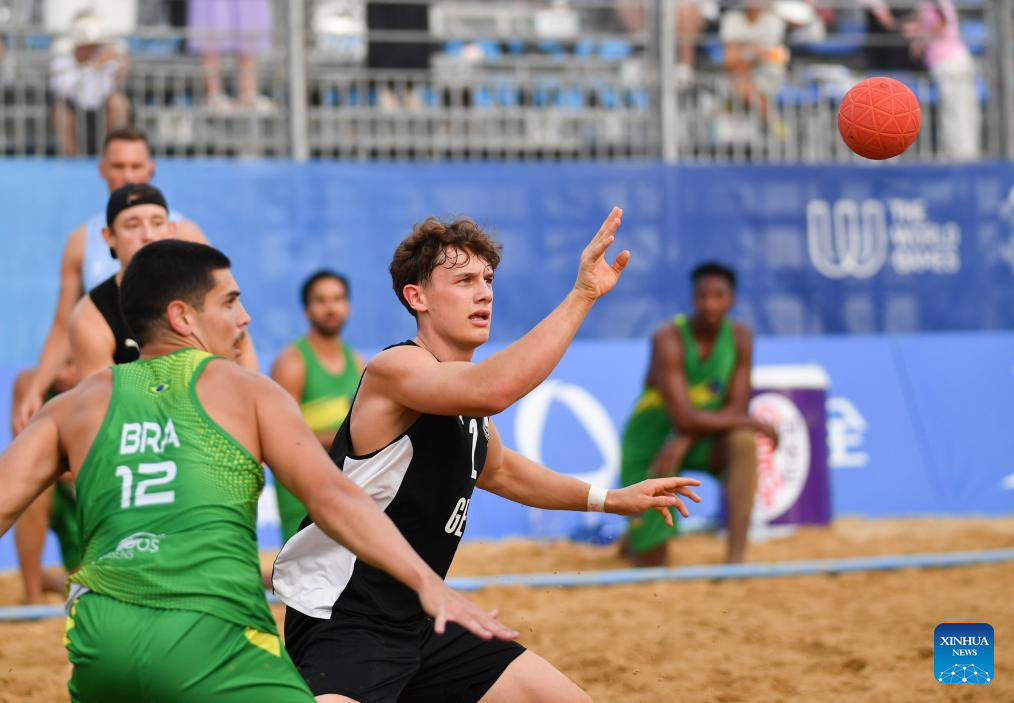 Robin John (R) of Germany competes during the Men's Semifinal between Germany and Brazil of the Beach Handball event at The World Games 2025 in Chengdu, southwest China's Sichuan Province, Aug. 11, 2025. (Xinhua/Zhang Bowen)