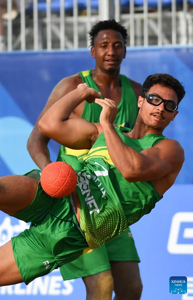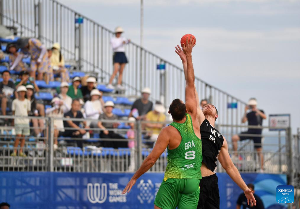 Rai Goncalves (front) of Brazil competes during the Men's Semifinal between Germany and Brazil of the Beach Handball event at The World Games 2025 in Chengdu, southwest China's Sichuan Province, Aug. 11, 2025. (Xinhua/Zhang Bowen)