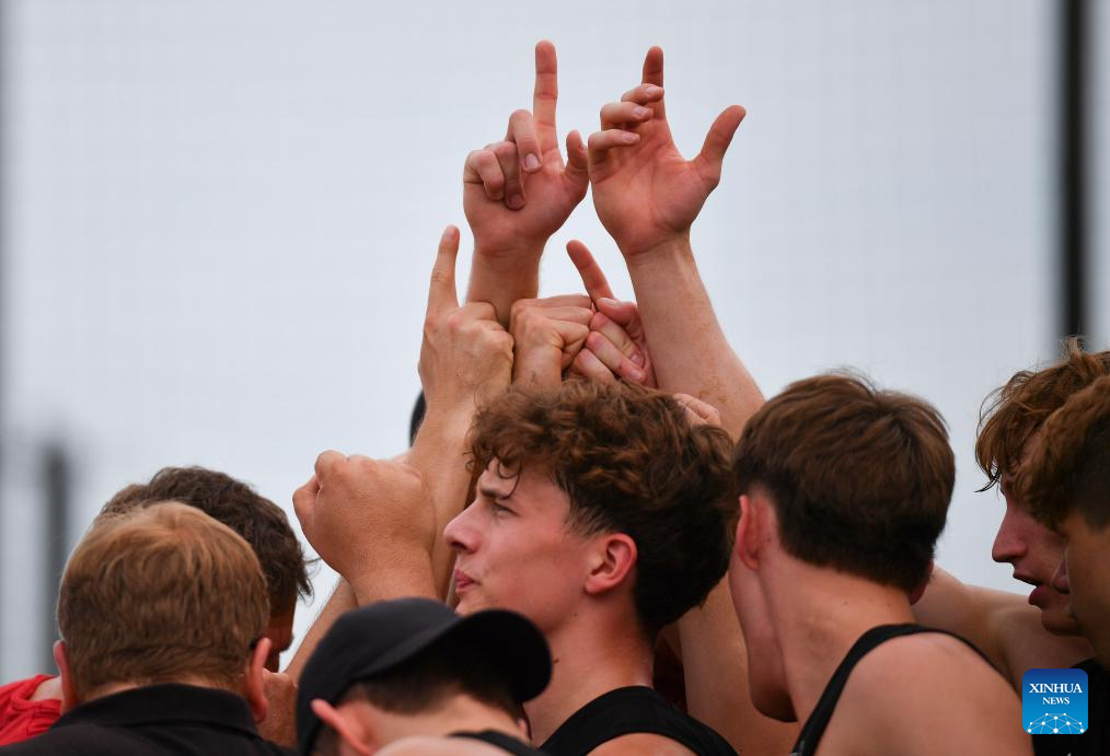 Players of Germany cheer up before the Men's Semifinal between Germany and Brazil of the Beach Handball event at The World Games 2025 in Chengdu, southwest China's Sichuan Province, Aug. 11, 2025. (Xinhua/Zhang Bowen)