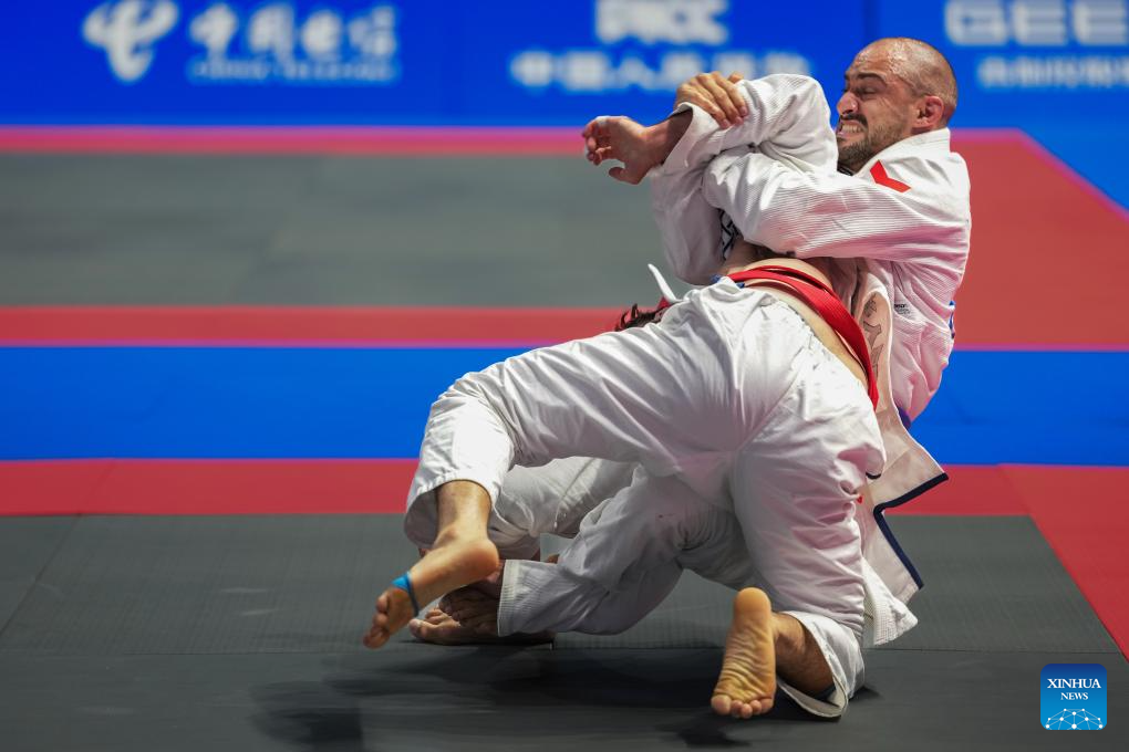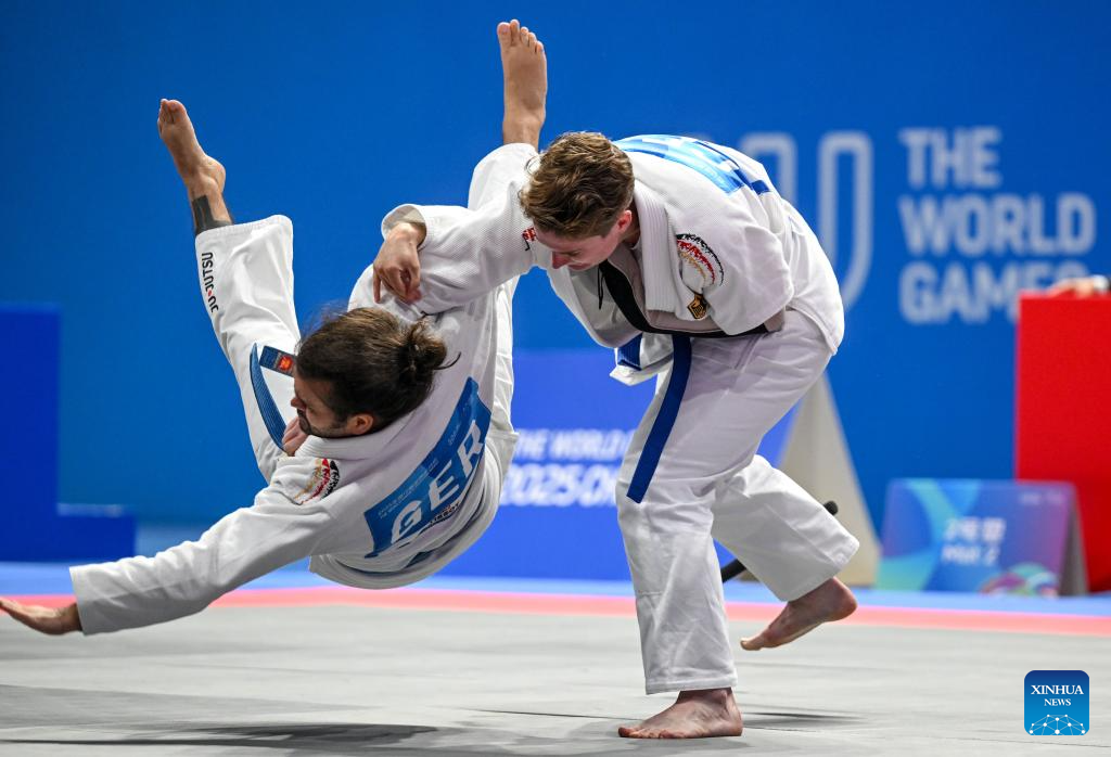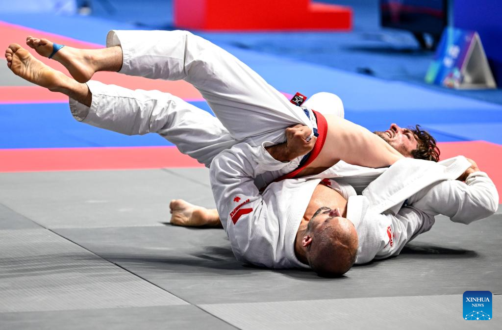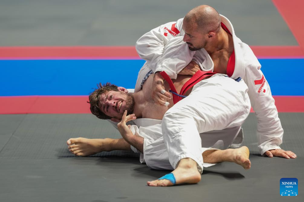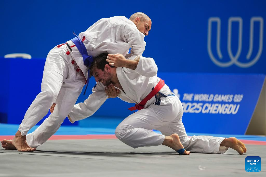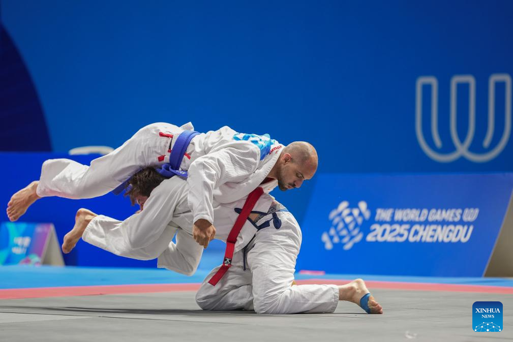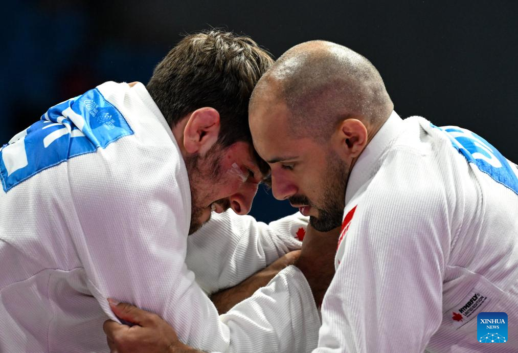 Nathan Dos Santos (R) of Canada competes against Nimrod Ryeder of Israel during the Men's Open Ne-waza Gold Medal Match of Ju-jitsu event at The World Games 2025 in Chengdu, southwest China's Sichuan Province, Aug. 12, 2025. (Xinhua/Feng Kaihua)