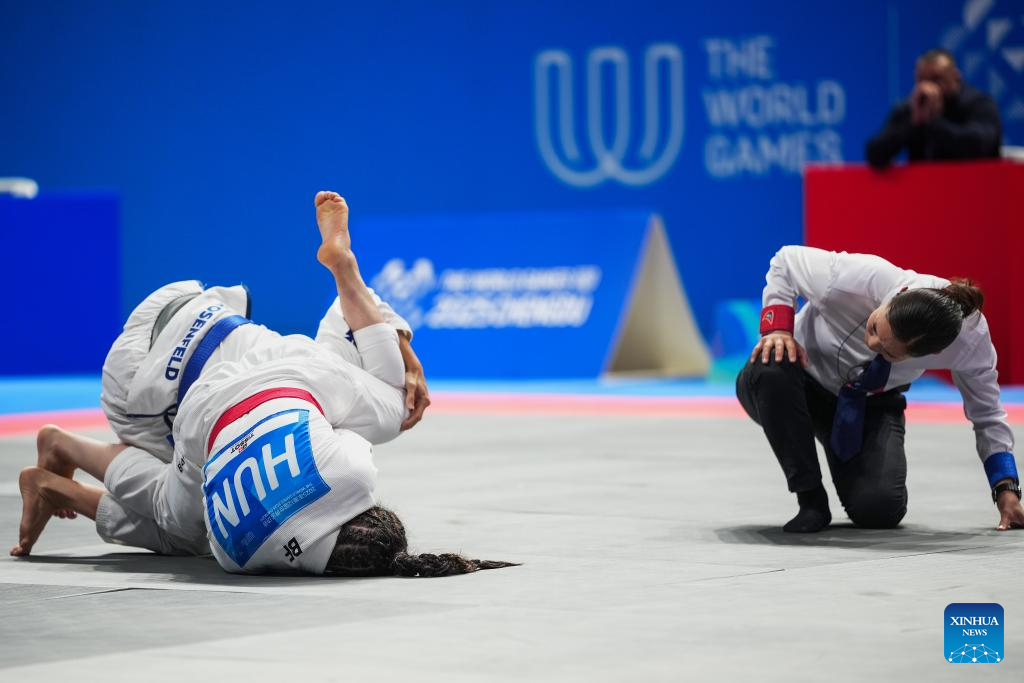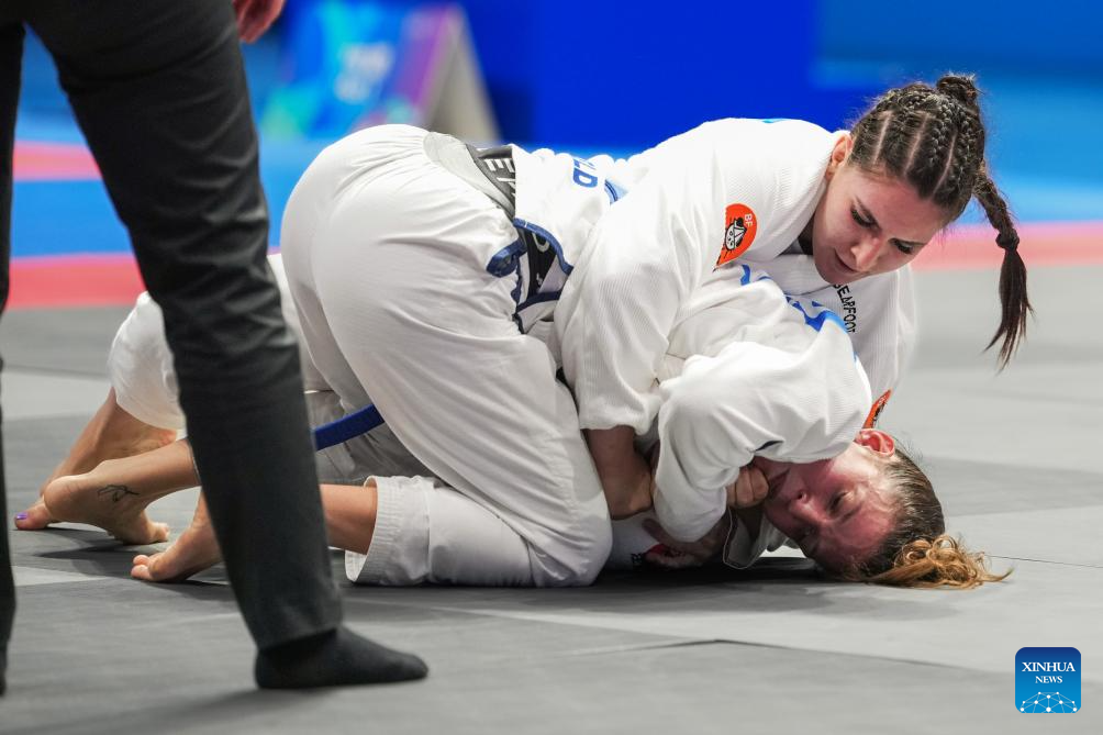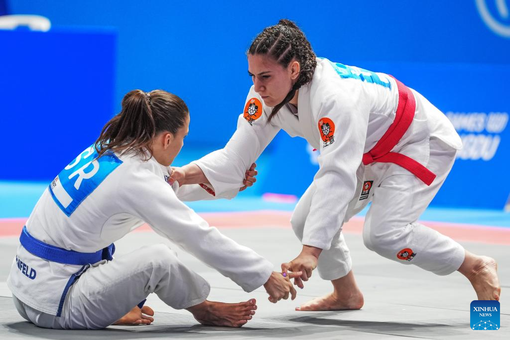 Tamara Toros (R) of Hungary competes against Meshi Rosenfeld of Israel during the Women's Open Ne-waza Gold Medal Match of Ju-jitsu event at The World Games 2025 in Chengdu, southwest China's Sichuan Province, Aug. 12, 2025. (Xinhua/Jiang Hongjing)