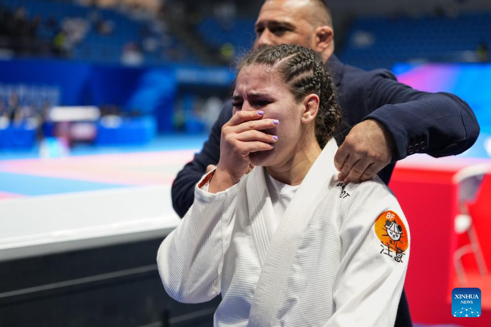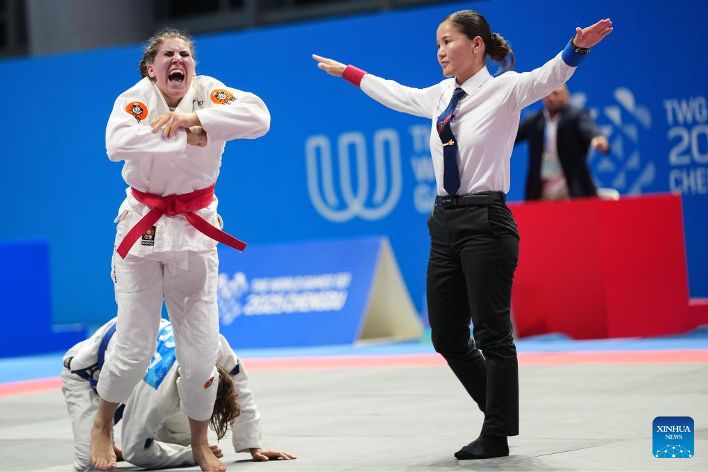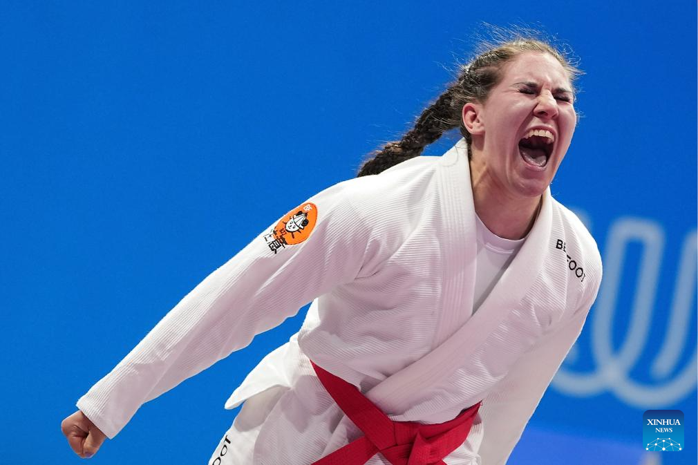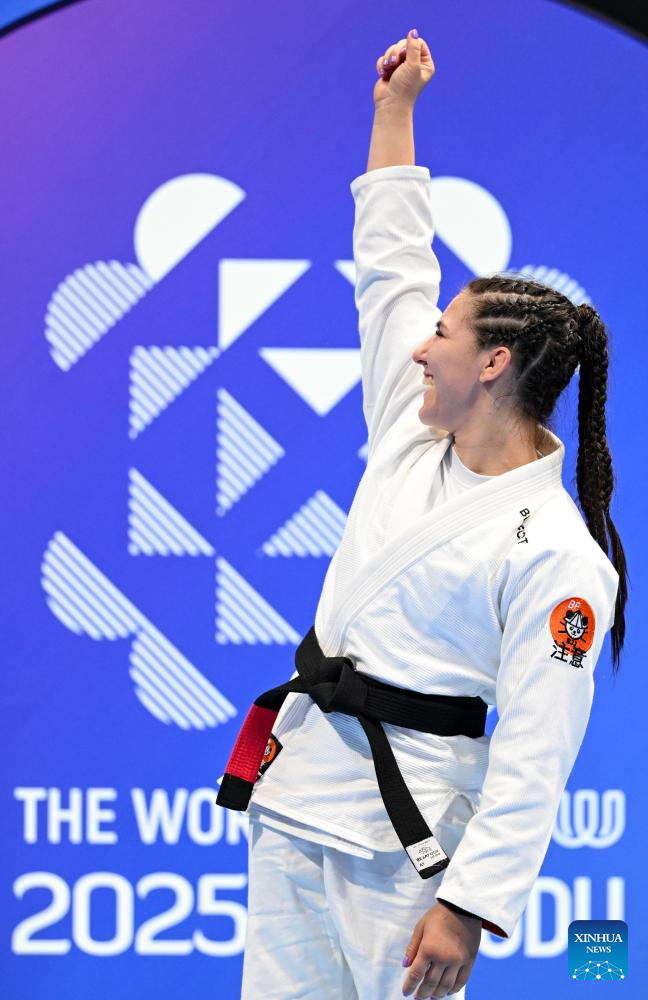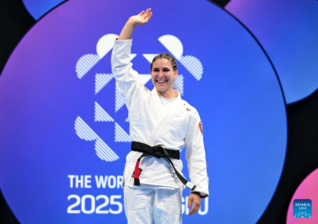 Tamara Toros of Hungary celebrates winning the Women's Open Ne-waza Gold Medal Match against Meshi Rosenfeld of Israel of Ju-jitsu event at The World Games 2025 in Chengdu, southwest China's Sichuan Province, Aug. 12, 2025. (Xinhua/Jiang Hongjing)