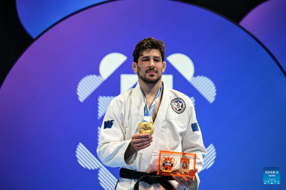 Gold medalist Nimrod Ryeder of Israel pose during the Men's Open Ne-waza awarding ceremony of Ju-jitsu event at The World Games 2025 in Chengdu, southwest China's Sichuan Province, Aug. 12, 2025. (Xinhua/Feng Kaihua)