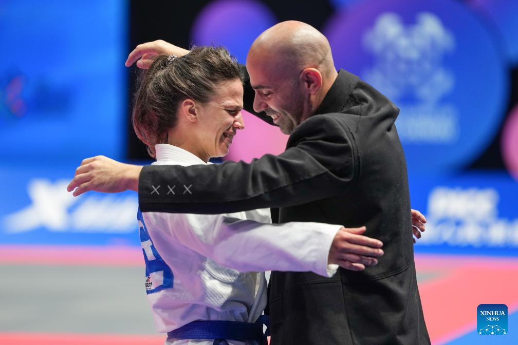 Tamara Toros (L) of Hungary celebrates winning the Women's Open Ne-waza Gold Medal Match against Meshi Rosenfeld of Israel of Ju-jitsu event at The World Games 2025 in Chengdu, southwest China's Sichuan Province, Aug. 12, 2025. (Xinhua/Jiang Hongjing)