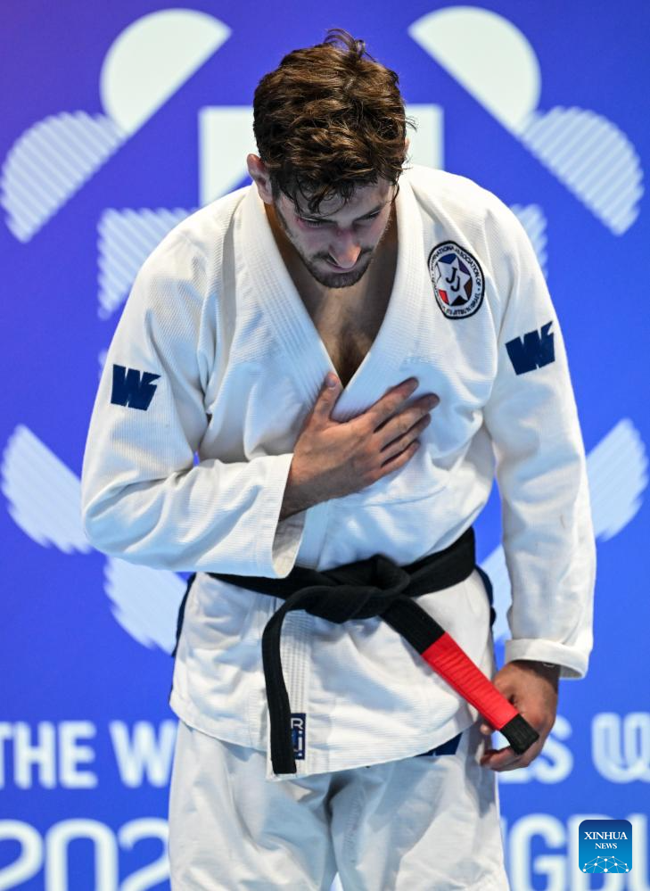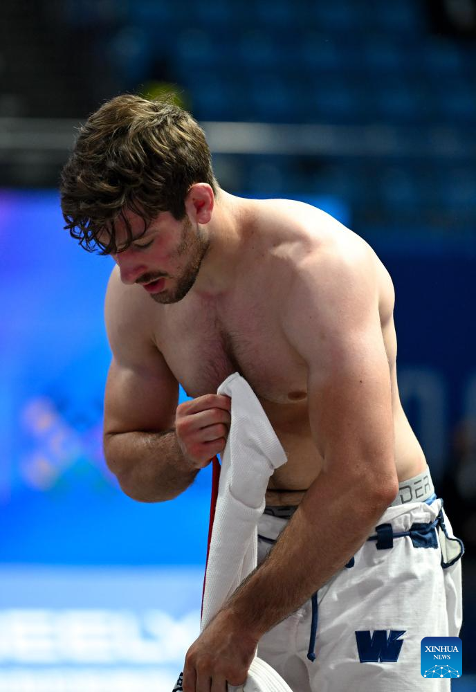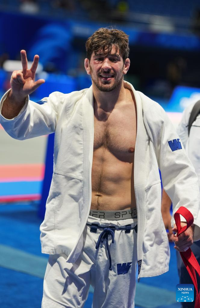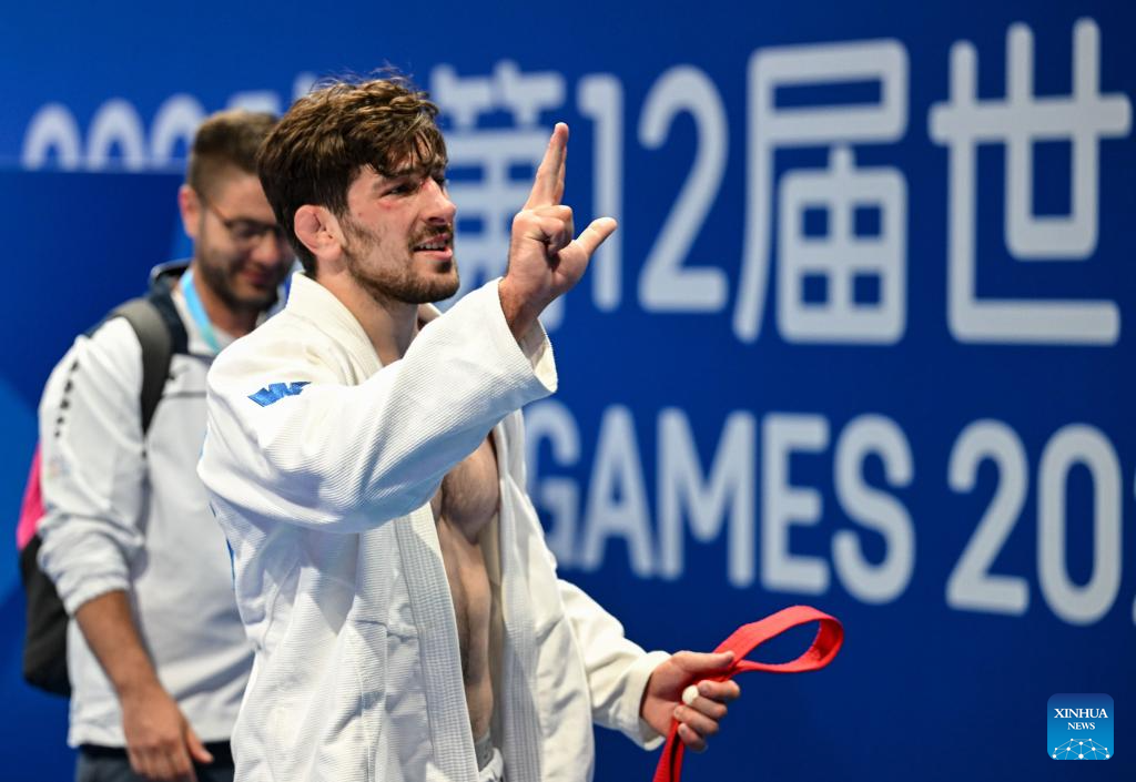 Nimrod Ryeder of Israel is seen after the Men's Open Ne-waza Gold Medal Match against Nathan Dos Santos of Canada of Ju-jitsu event at The World Games 2025 in Chengdu, southwest China's Sichuan Province, Aug. 12, 2025. (Xinhua/Feng Kaihua)
