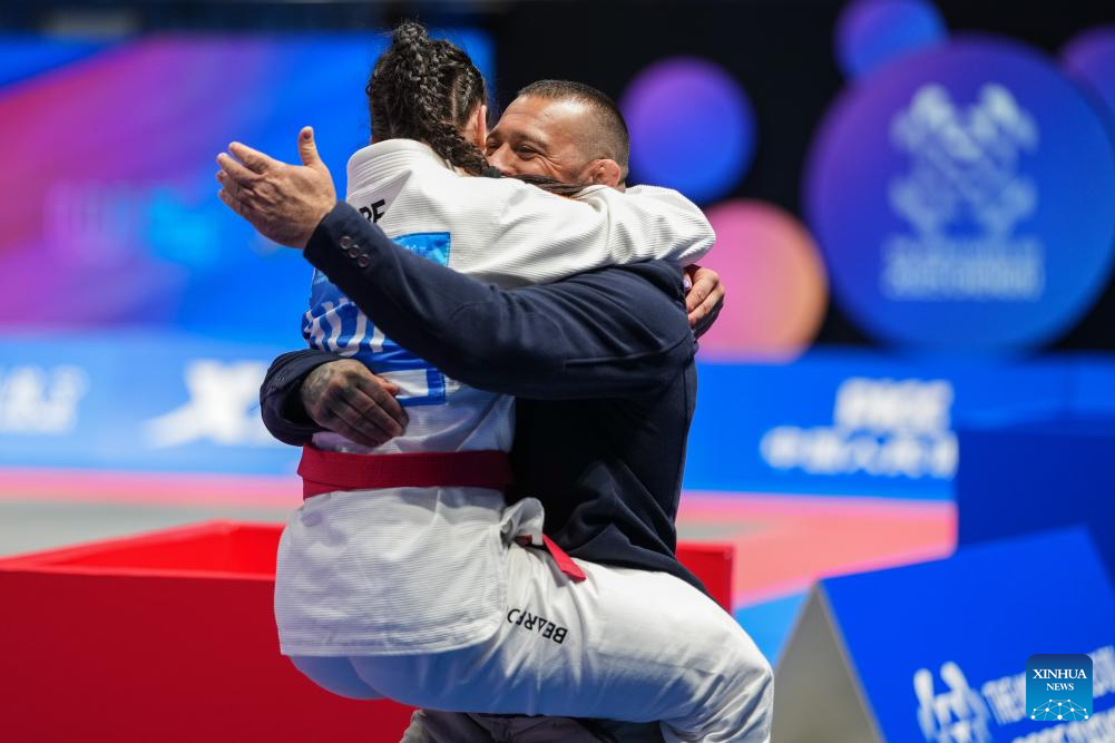 Meshi Rosenfeld (L) of Israel hugs her coach after the Women's Open Ne-waza Gold Medal match against Tamara Toros of Hungary of Ju-jitsu event at The World Games 2025 in Chengdu, southwest China's Sichuan Province, Aug. 12, 2025. (Xinhua/Jiang Hongjing)