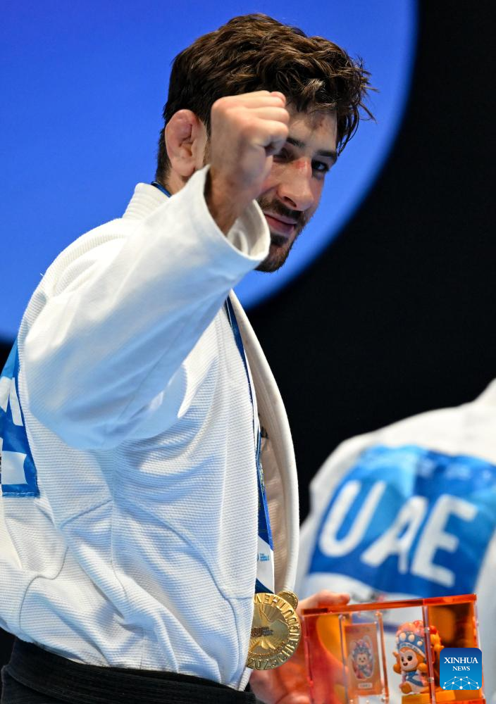 Gold medalist Nimrod Ryeder of Israel gestures during the Men's Open Ne-waza awarding ceremony of Ju-jitsu event at The World Games 2025 in Chengdu, southwest China's Sichuan Province, Aug. 12, 2025. (Xinhua/Feng Kaihua)