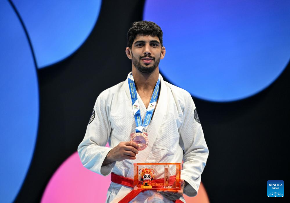 Bronze medalist Mohamed Ali Alsuwaidi of Saudi Arabia poses during the Men's Open Ne-waza awarding ceremony of Ju-Jitsu event at The World Games 2025 in Chengdu, southwest China's Sichuan Province, Aug. 12, 2025. (Xinhua/Feng Kaihua)