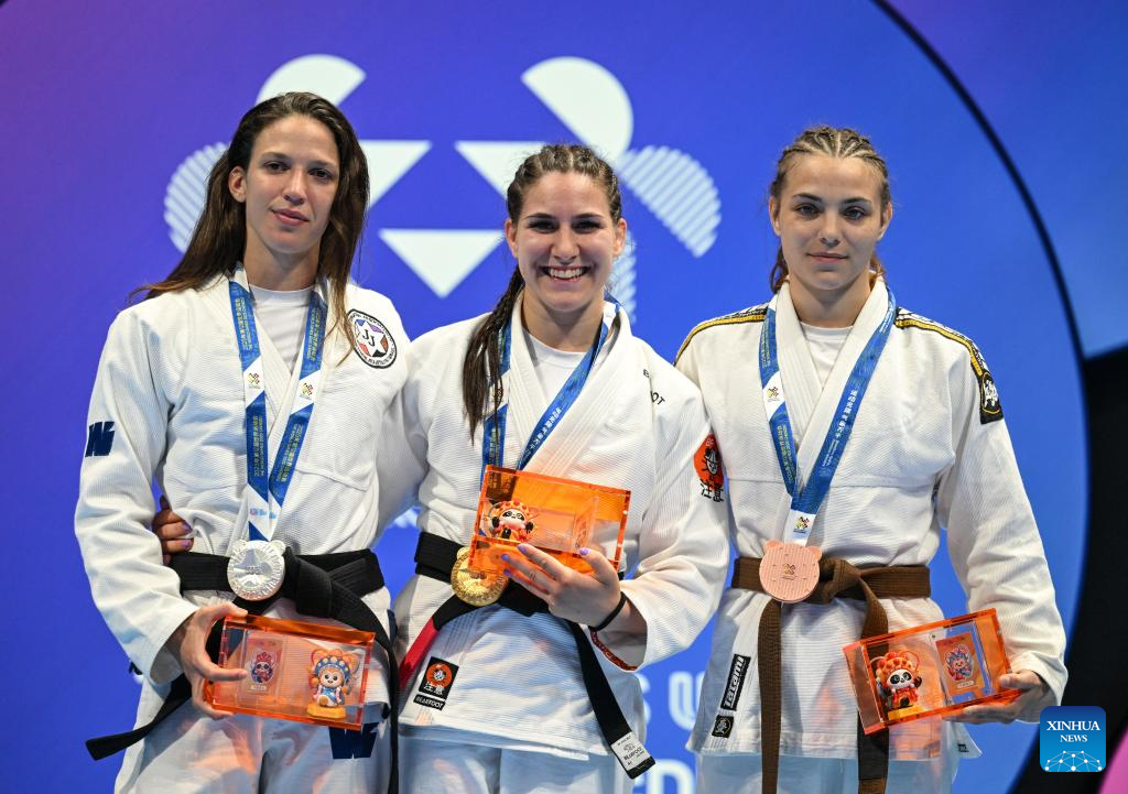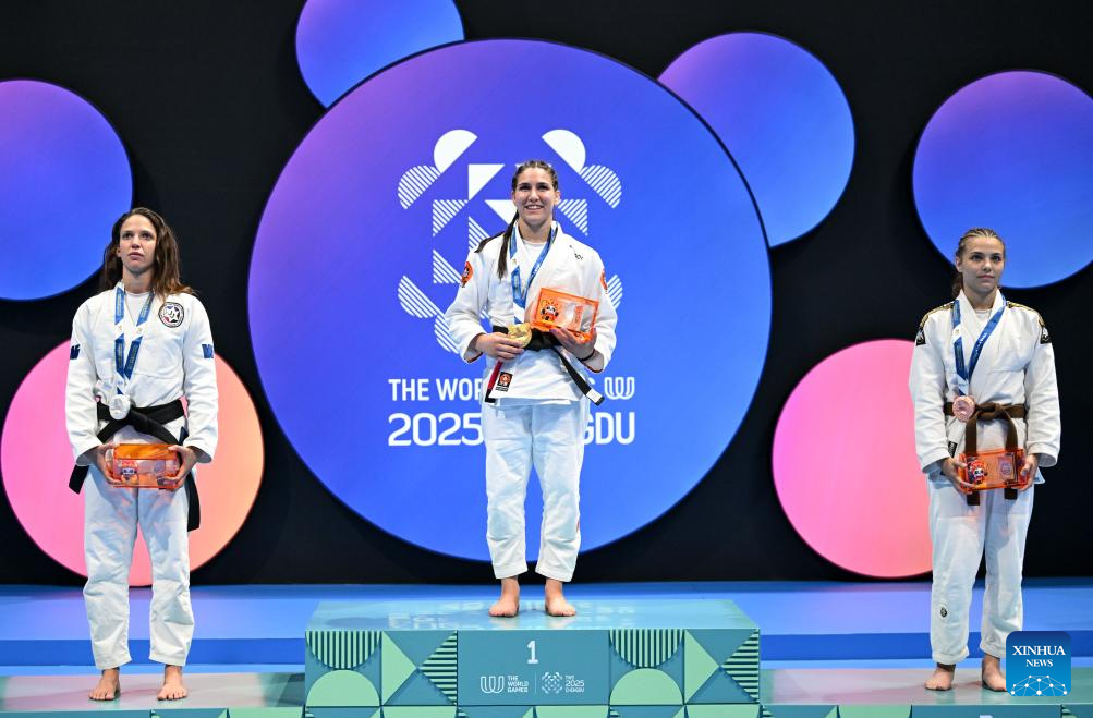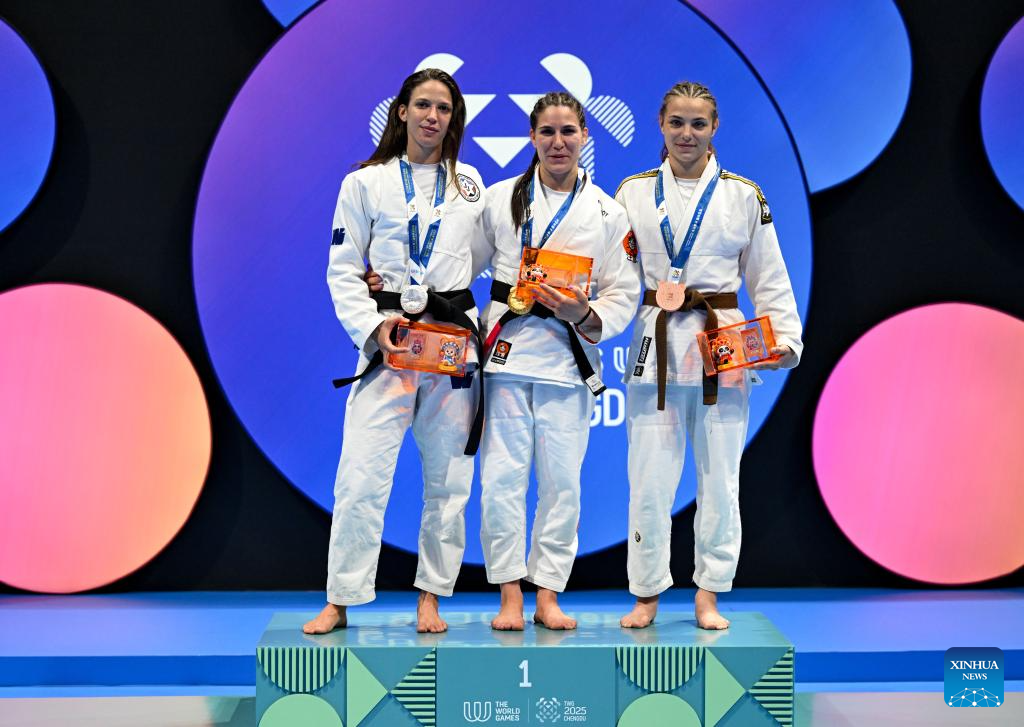 Gold medalist Tamara Toros (C) of Hungary, sliver medalist Meshi Rosenfeld (L) of Israel and bronze medalist Alexa Toth of Hungary pose during the Women's Open Ne-Waza awarding ceremony of Ju-Jitsu event at The World Games 2025 in Chengdu, southwest China's Sichuan Province, Aug. 12, 2025. (Xinhua/Feng Kaihua)