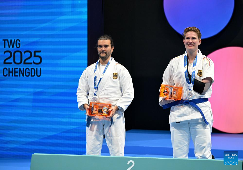 Sliver medalists Alessandro Schober (L)/Christine Jahn of Germany react during the Mixed Duo Para Physical awarding ceremony of Ju-Jitsu event at The World Games 2025 in Chengdu, southwest China's Sichuan Province, Aug. 12, 2025. (Xinhua/Feng Kaihua)