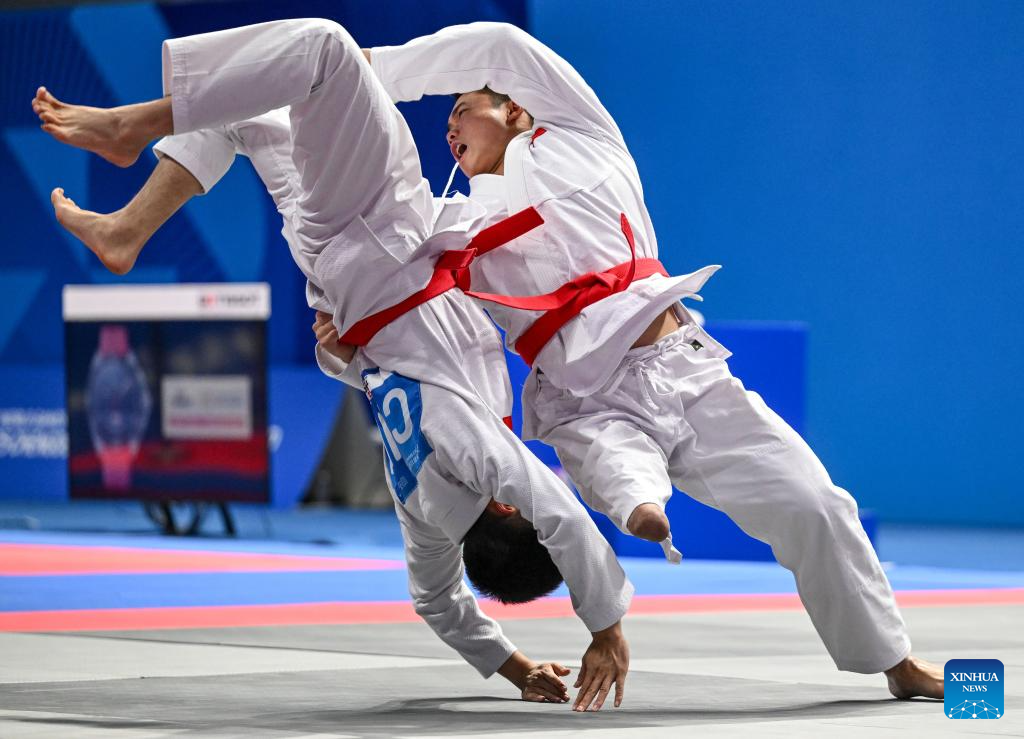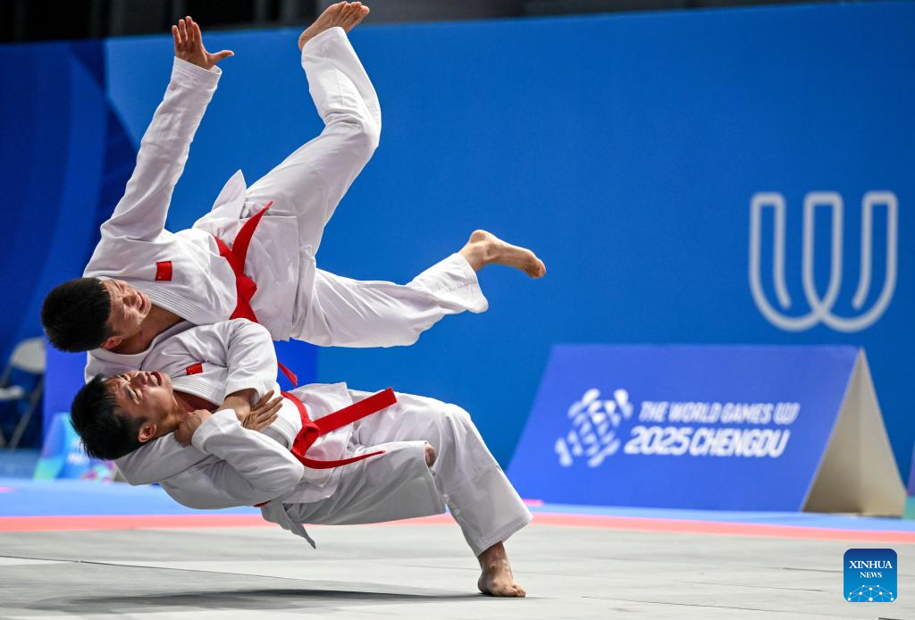 Li Yucai (R)/Guo Ao of China compete during the Mixed Duo Para Physical Finals Gold Medal Match of Ju-Jitsu event at The World Games 2025 in Chengdu, southwest China's Sichuan Province, Aug. 12, 2025. (Xinhua/Feng Kaihua)
