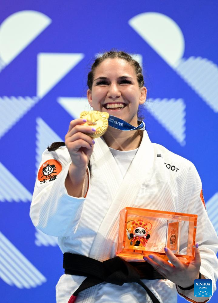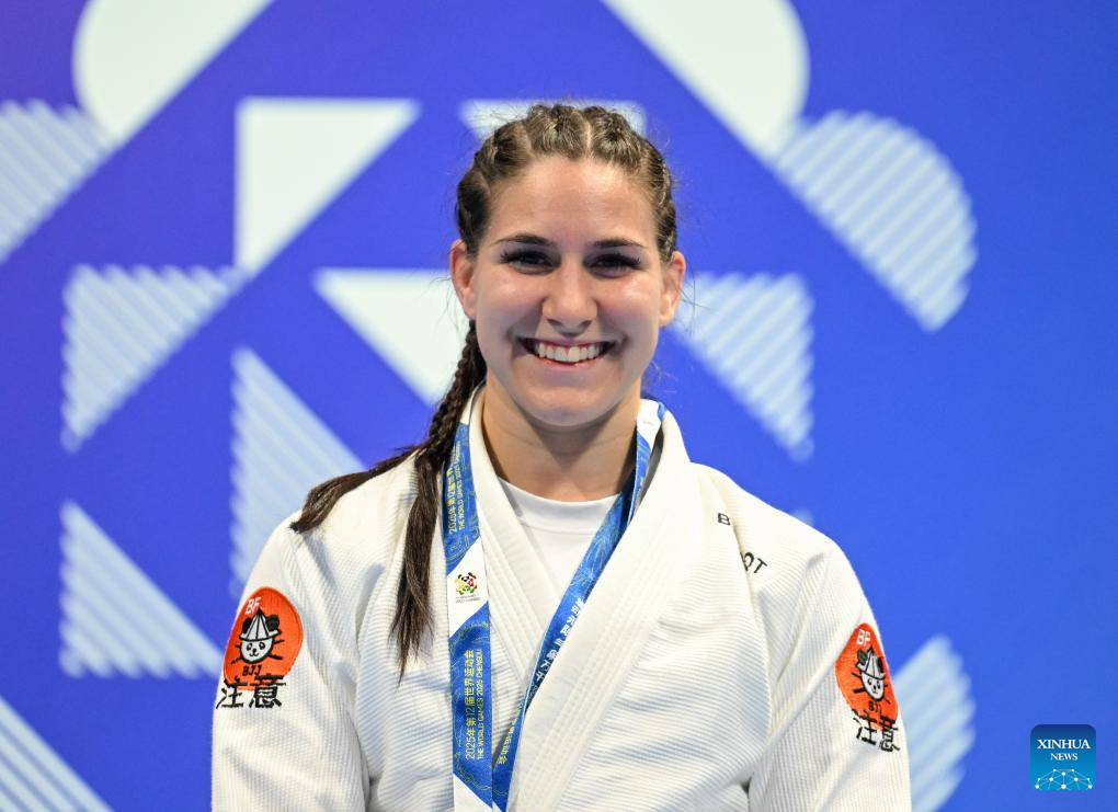 Gold medalist Tamara Toros of Hungary poses during the Women's Open Ne-Waza awarding ceremony of Ju-Jitsu event at The World Games 2025 in Chengdu, southwest China's Sichuan Province, Aug. 12, 2025. (Xinhua/Feng Kaihua)