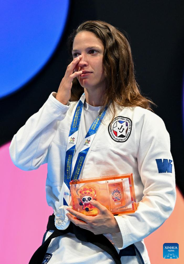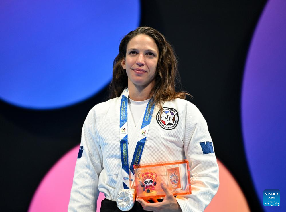 Sliver medalist Meshi Rosenfeld of Israel reacts during the Women's Open Ne-Waza awarding ceremony of Ju-Jitsu event at The World Games 2025 in Chengdu, southwest China's Sichuan Province, Aug. 12, 2025. (Xinhua/Feng Kaihua)