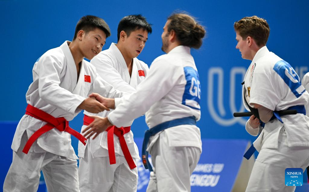 Li Yucai (2nd L)/Guo Ao (1st L) of China shake hands with Alessandro Schober (2nd R)/Christine Jahn of Germany after the Mixed Duo Para Physical Finals Gold Medal Match of Ju-Jitsu event at The World Games 2025 in Chengdu, southwest China's Sichuan Province, Aug. 12, 2025. (Xinhua/Feng Kaihua)