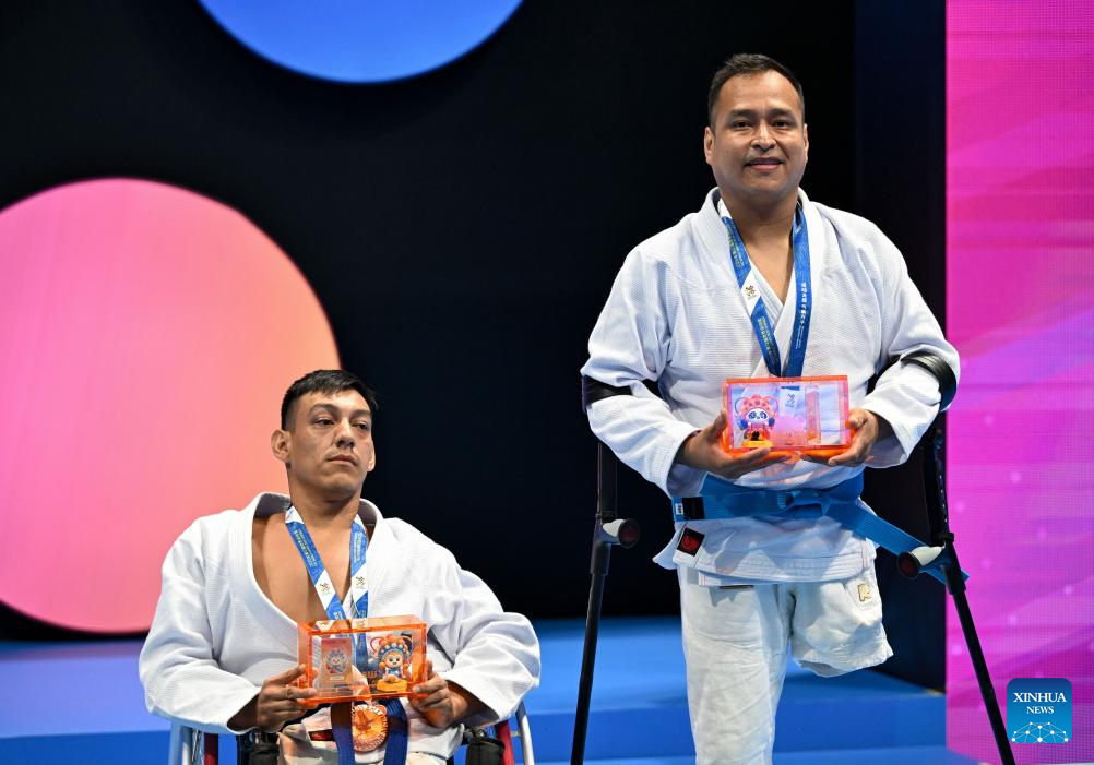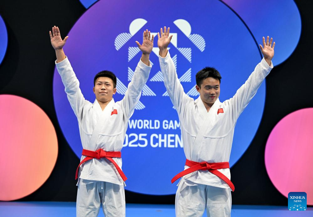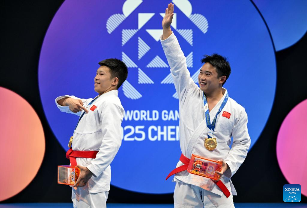 Gold medalists Li Yucai (R)/Guo Ao of China celebrate during the Mixed Duo Para Physical awarding ceremony of Ju-Jitsu event at The World Games 2025 in Chengdu, southwest China's Sichuan Province, Aug. 12, 2025. (Xinhua/Feng Kaihua)