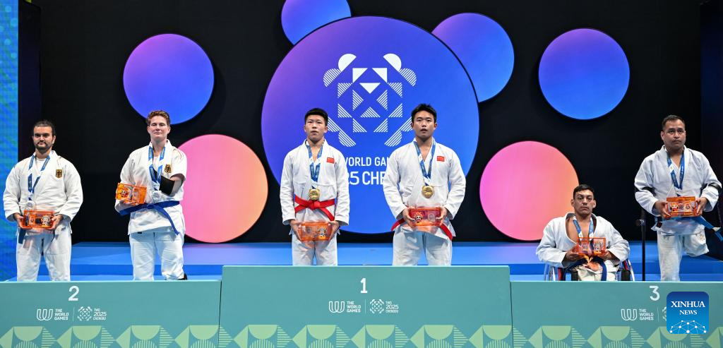 Gold medalists Li Yucai (2nd R)/Guo Ao (3rd L) of China, sliver medalists Alessandro Schober (1st L)/Christine Jahn (2nd L) of Germany and bronze medalists Manuel Alberto Cisneros De Los Santos (3rd R)/Jose Gilberto Moreno Aguila of Mexico pose during the Mixed Duo Para Physical awarding ceremony of Ju-Jitsu event at The World Games 2025 in Chengdu, southwest China's Sichuan Province, Aug. 12, 2025. (Xinhua/Feng Kaihua)