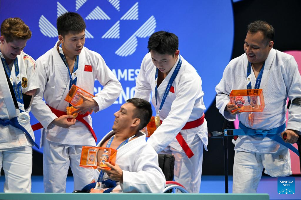 Gold medalist Li Yucai (2nd R) of China helps bronze medalist Manuel Alberto Cisneros De Los Santos (C) of Mexico moving the wheelchair to take photos during the Mixed Duo Para Physical awarding ceremony of Ju-Jitsu event at The World Games 2025 in Chengdu, southwest China's Sichuan Province, Aug. 12, 2025. (Xinhua/Feng Kaihua)