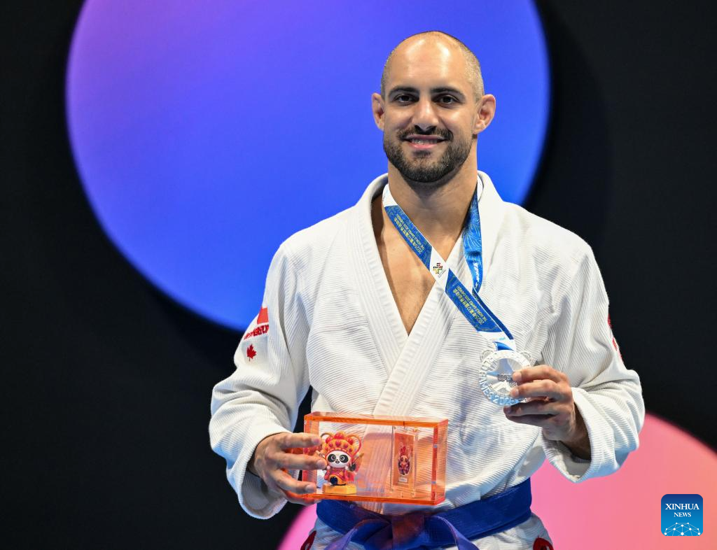Sliver medalist Nathan Dos Santos of Canada poses during the Men's Open Ne-waza awarding ceremony of Ju-Jitsu event at The World Games 2025 in Chengdu, southwest China's Sichuan Province, Aug. 12, 2025. (Xinhua/Feng Kaihua)