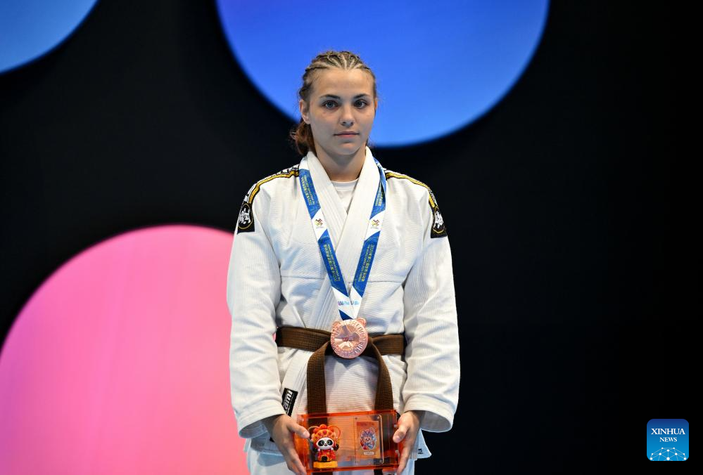 Bronze medalist Alexa Toth of Hungary reacts during the Women's Open Ne-Waza awarding ceremony of Ju-Jitsu event at The World Games 2025 in Chengdu, southwest China's Sichuan Province, Aug. 12, 2025. (Xinhua/Feng Kaihua)