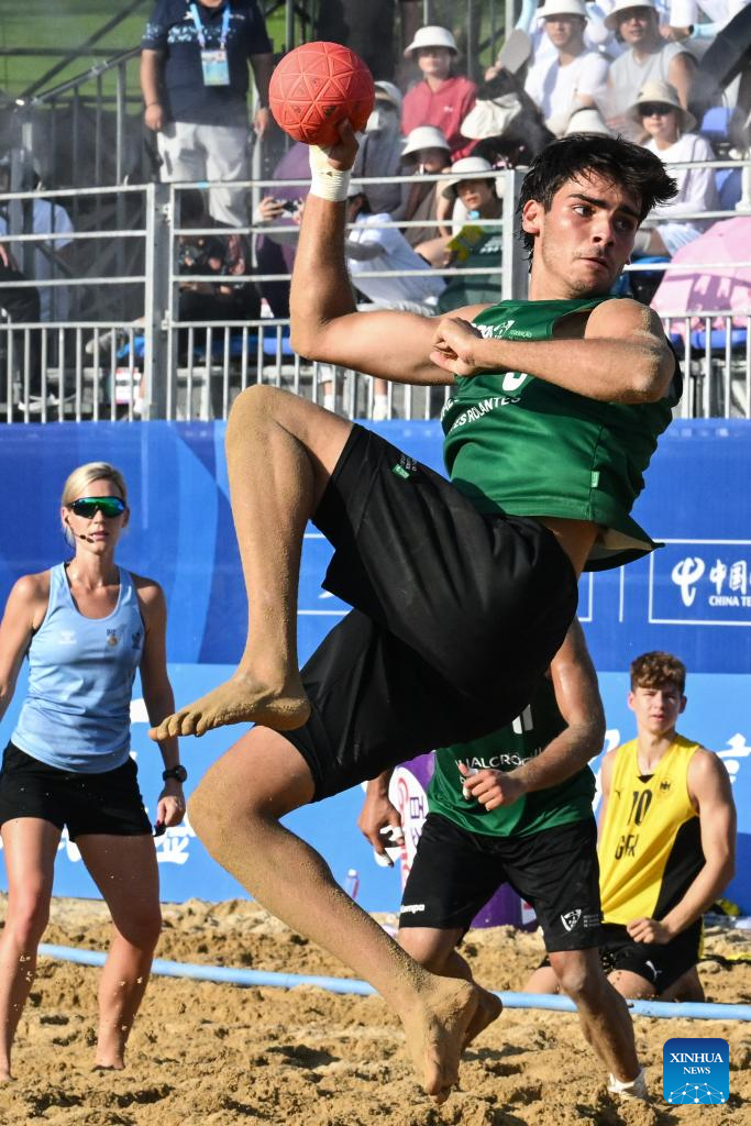 Rodrigo Gomes of Portugal competes during the Beach Handball Men's Final Match between Portugal and Germany at The World Games 2025 in Chengdu, southwest China's Sichuan Province, Aug. 12, 2025. (Xinhua/Chen Zhenhai)