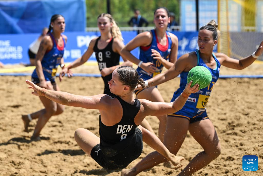 Freja Hansen (front) of Denmark competes during the Women's Finals Bronze Medal Match between Spain and Denmark of Beach Handball event at The World Games 2025 in Chengdu, southwest China's Sichuan Province, Aug. 12, 2025. (Xinhua/Chen Zhenhai)