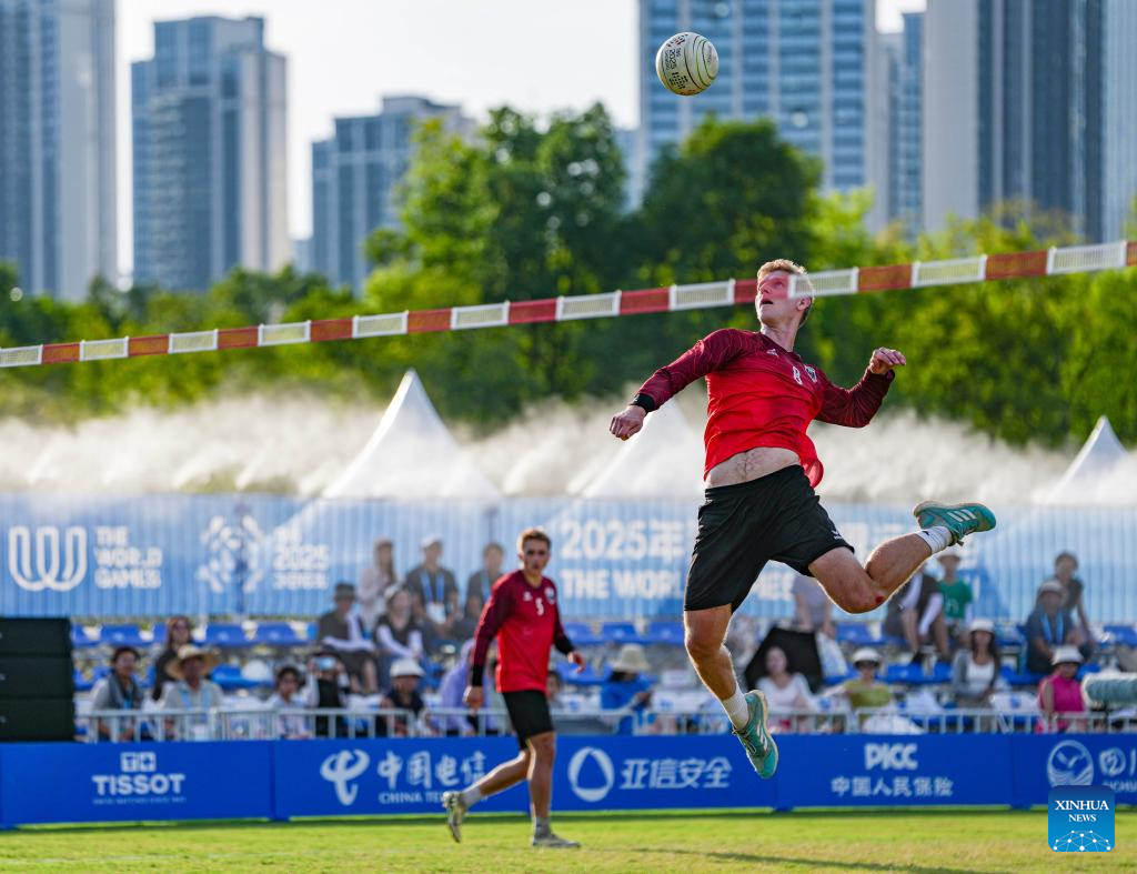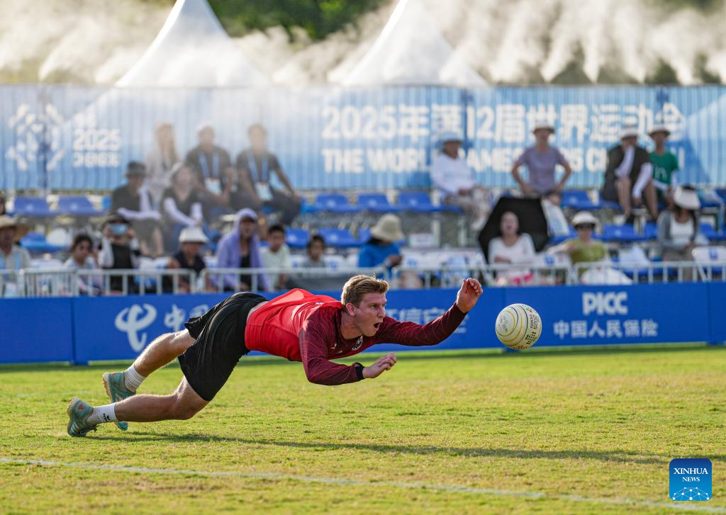 Karl Mullehner of Austria competes during the Fistball Men's Semifinal Match between Germany and Austria at The World Games 2025 in Chengdu, southwest China's Sichuan Province, Aug. 12, 2025. (Xinhua/Tenzin Nyida)