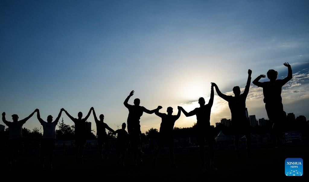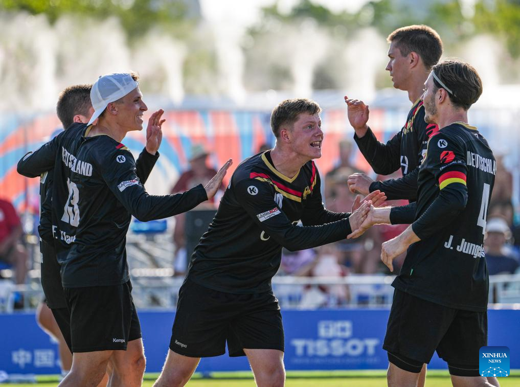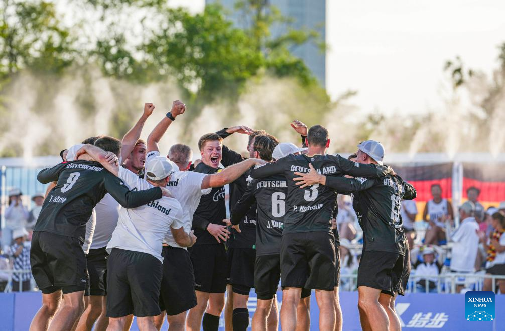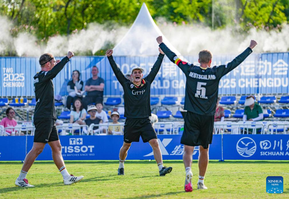 Players of Germany celebrate during the Fistball Men's Semifinal Match between Germany and Austria at The World Games 2025 in Chengdu, southwest China's Sichuan Province, Aug. 12, 2025. (Xinhua/Tenzin Nyida)