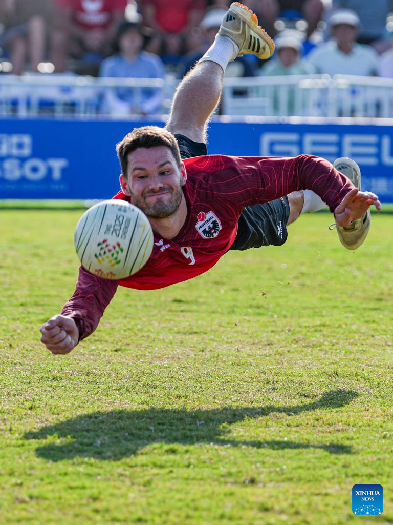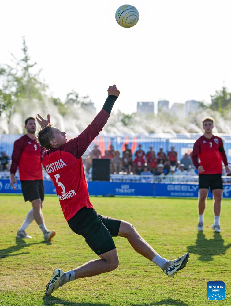 Martin Puhringer of Austria competes during the Fistball Men's Semifinal Match between Germany and Austria at The World Games 2025 in Chengdu, southwest China's Sichuan Province, Aug. 12, 2025. (Xinhua/Tenzin Nyida)