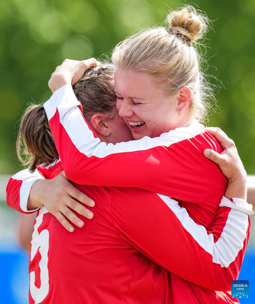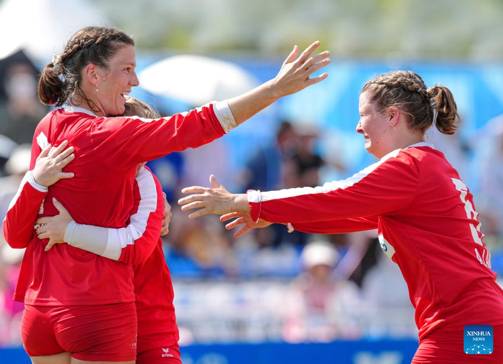 Players of Switzerland celebrate after the Fistball Women's Semifinal Match between Germany and Switzerland at The World Games 2025 in Chengdu, southwest China's Sichuan Province, Aug. 12, 2025. (Xinhua/Tenzin Nyida)
