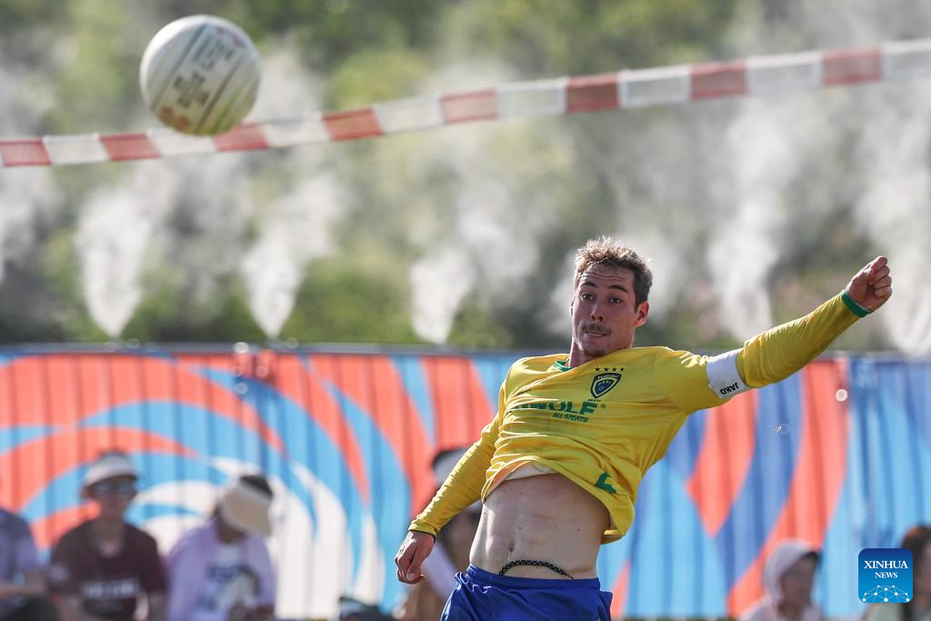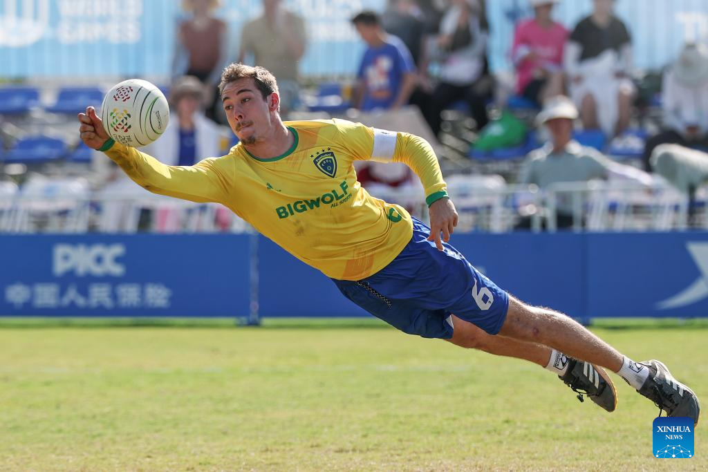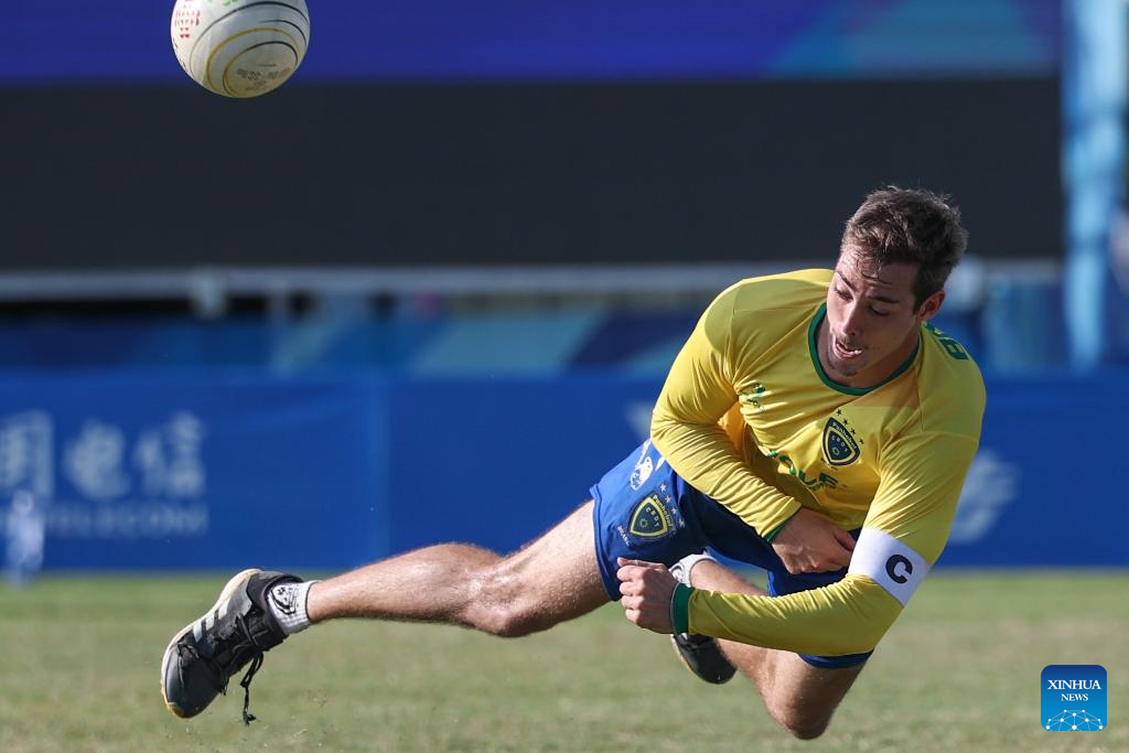 Gabriel Petry Heck of Brazil competes during the Fistball Men's Semifinal Match between Brazil and Switzerland at The World Games 2025 in Chengdu, southwest China's Sichuan Province, Aug. 12, 2025. (Xinhua/Chen Cheng)