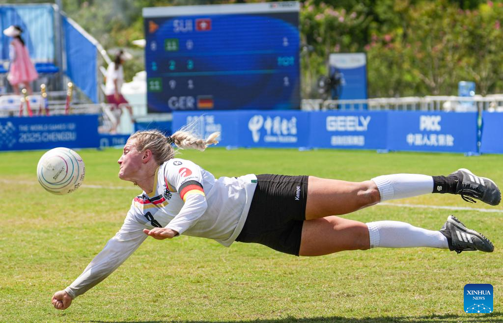 Ann-Kathrin Motteler of Germany competes during the Fistball Women's Semifinal Match between Germany and Switzerland at The World Games 2025 in Chengdu, southwest China's Sichuan Province, Aug. 12, 2025. (Xinhua/Tenzin Nyida)