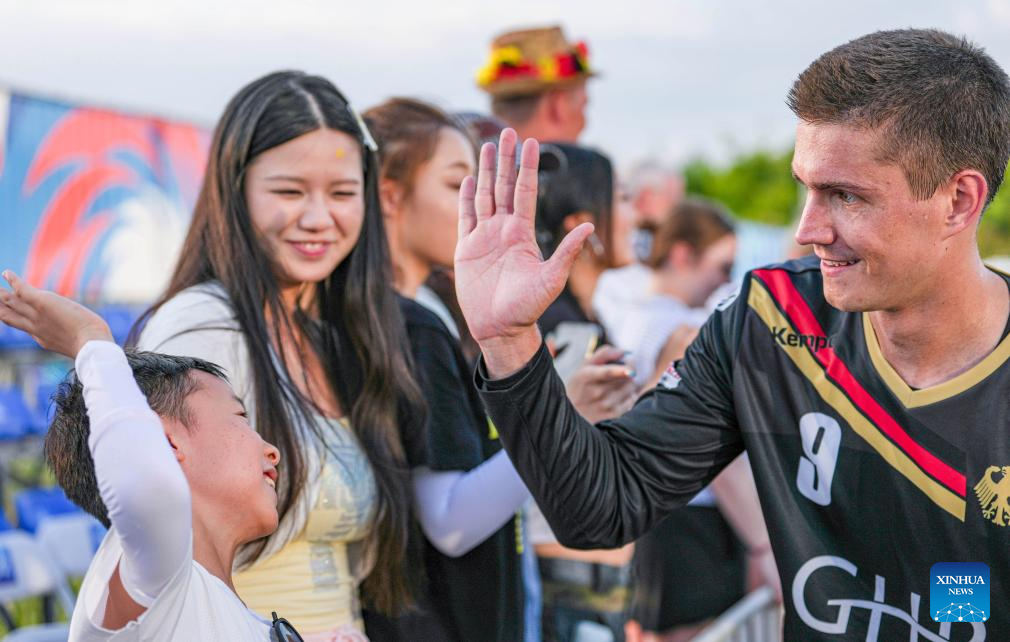 Timon Lutzow (R) of Germany claps hands with a child after the Fistball Men's Semifinal Match between Germany and Austria at The World Games 2025 in Chengdu, southwest China's Sichuan Province, Aug. 12, 2025. (Xinhua/Tenzin Nyida)